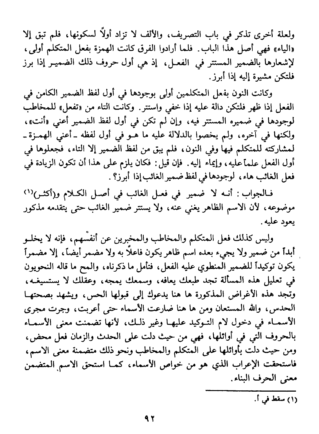 " أنت " ولكنها في آخره، ولم يخصوا بالدلالة عليه ما هو في أول لفظه - أعني الهمزة - لمشاركته للمتكلم فيها وفي النون، فلم يبق من لفظ الضمير إلا التاء، فجعلوها في أول الفعل علماً عليه، وإيماء إليه.