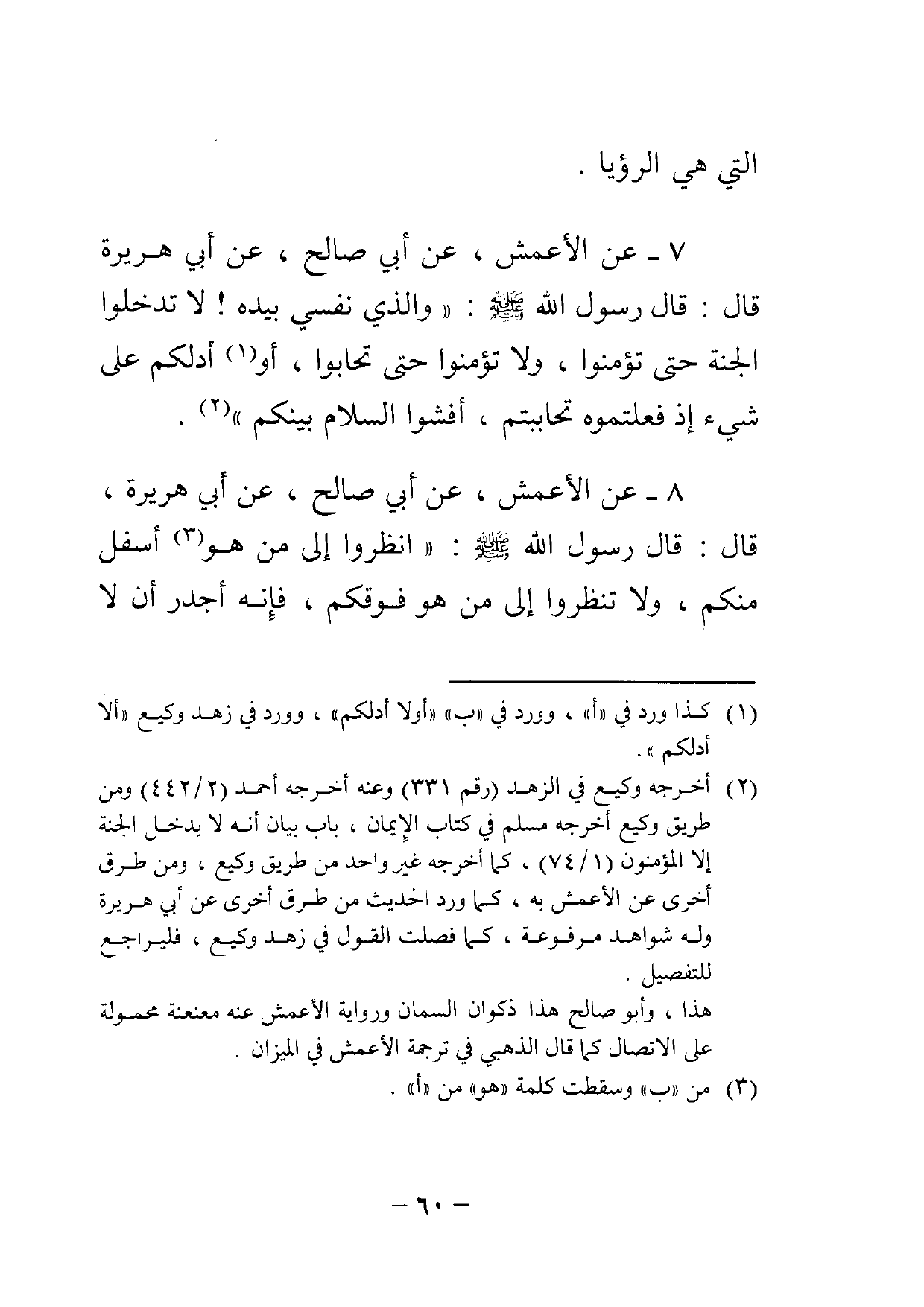 ٧ - عَنِ الْأَعْمَشِ، عَنْ أَبِي صَالِحٍ، عَنْ أَبِي هُرَيْرَةَ، قَالَ: قَالَ رَسُولُ اللَّهِ صَلَّى اللَّهُ عَلَيْهِ وَسَلَّمَ: «وَالَّذِي نَفْسِي بِيَدِهِ , لَا تَدْخُلُوا الْجَنَّةَ حَتَّى تُؤْمِنُوا، وَلَا تُؤْمِنُوا حَتَّى تَحَابُّوا، أَوَلَا أَدُلُّكُمْ عَلَى شَيْءٍ إِذْا فَعَلْتُمُوهُ تَحَابَبْتُمْ؟ أَفْشُوا السَّلَامَ بَيْنَكُمْ»