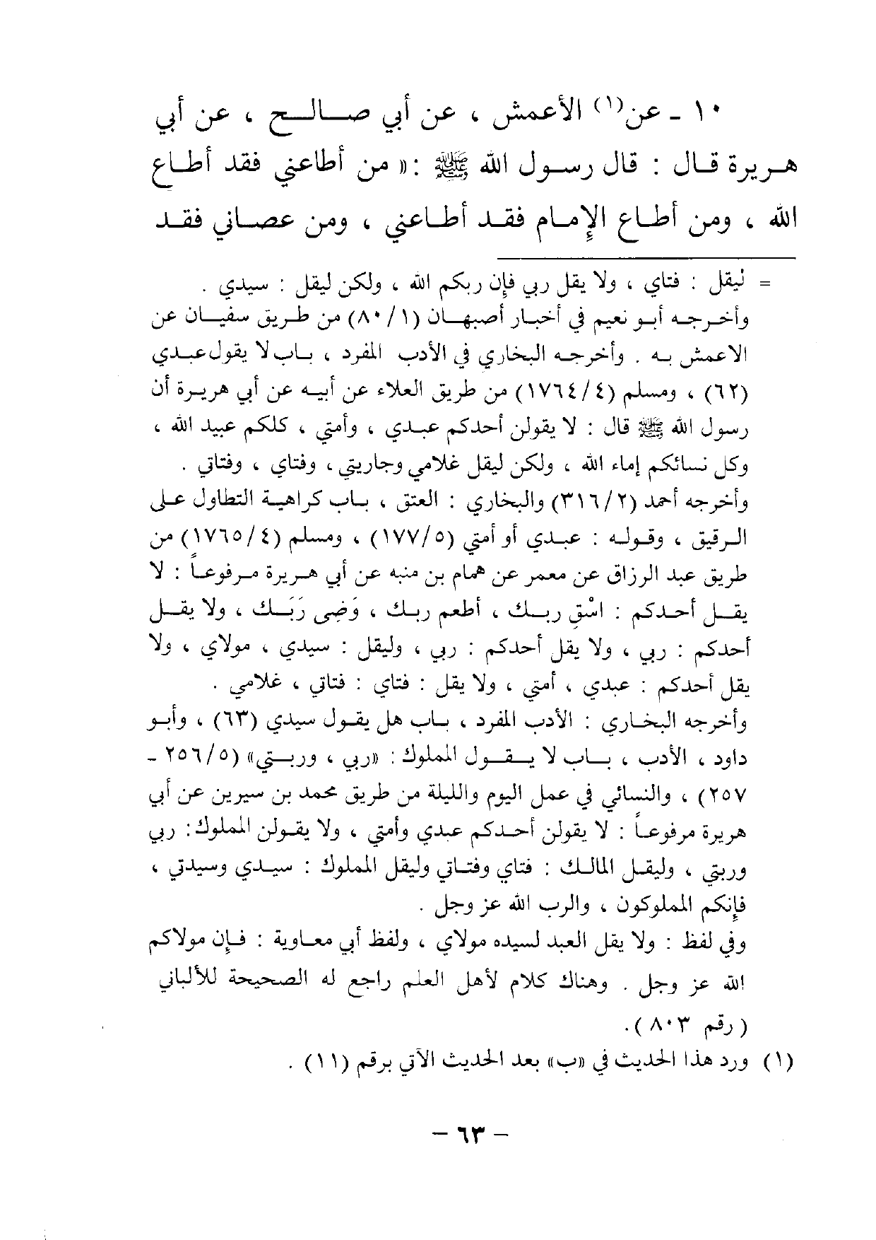 ١٠ - عَنِ الْأَعْمَشِ، عَنْ أَبِي صَالِحٍ، عَنْ أَبِي هُرَيْرَةَ، قَالَ: قَالَ رَسُولُ اللَّهِ صَلَّى اللَّهُ عَلَيْهِ وَسَلَّمَ: «مَنْ أَطَاعَنِي فَقَدْ أَطَاعَ اللَّهَ، وَمَنْ أَطَاعَ الْإِمَامَ فَقَدْ أَطَاعَنِي، وَمَنْ عَصَانِي فَقَدْ ⦗٦٤⦘ عَصَى اللَّهَ، وَمَنْ عَصَى الْإِمَامَ فَقَدْ عَصَانِي»