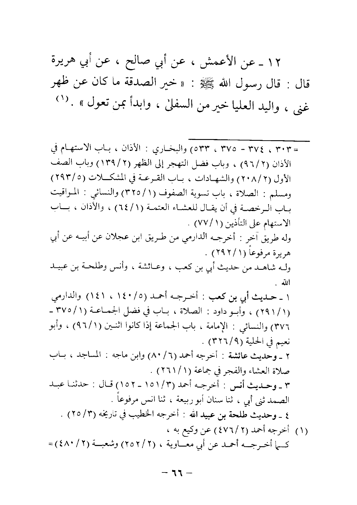 ١٢ - عَنِ الْأَعْمَشِ، عَنْ أَبِي صَالِحٍ، عَنْ أَبِي هُرَيْرَةَ، قَالَ: قَالَ رَسُولُ اللَّهِ صَلَّى اللَّهُ عَلَيْهِ وَسَلَّمَ: «خَيْرُ الصَّدَقَةِ مَا كَانَ عَنْ ظَهْرِ غِنًى، وَالْيَدُ الْعُلْيَا خَيْرٌ مِنَ السُّفْلَى، وَابْدَأْ بِمَنْ تَعُولُ»