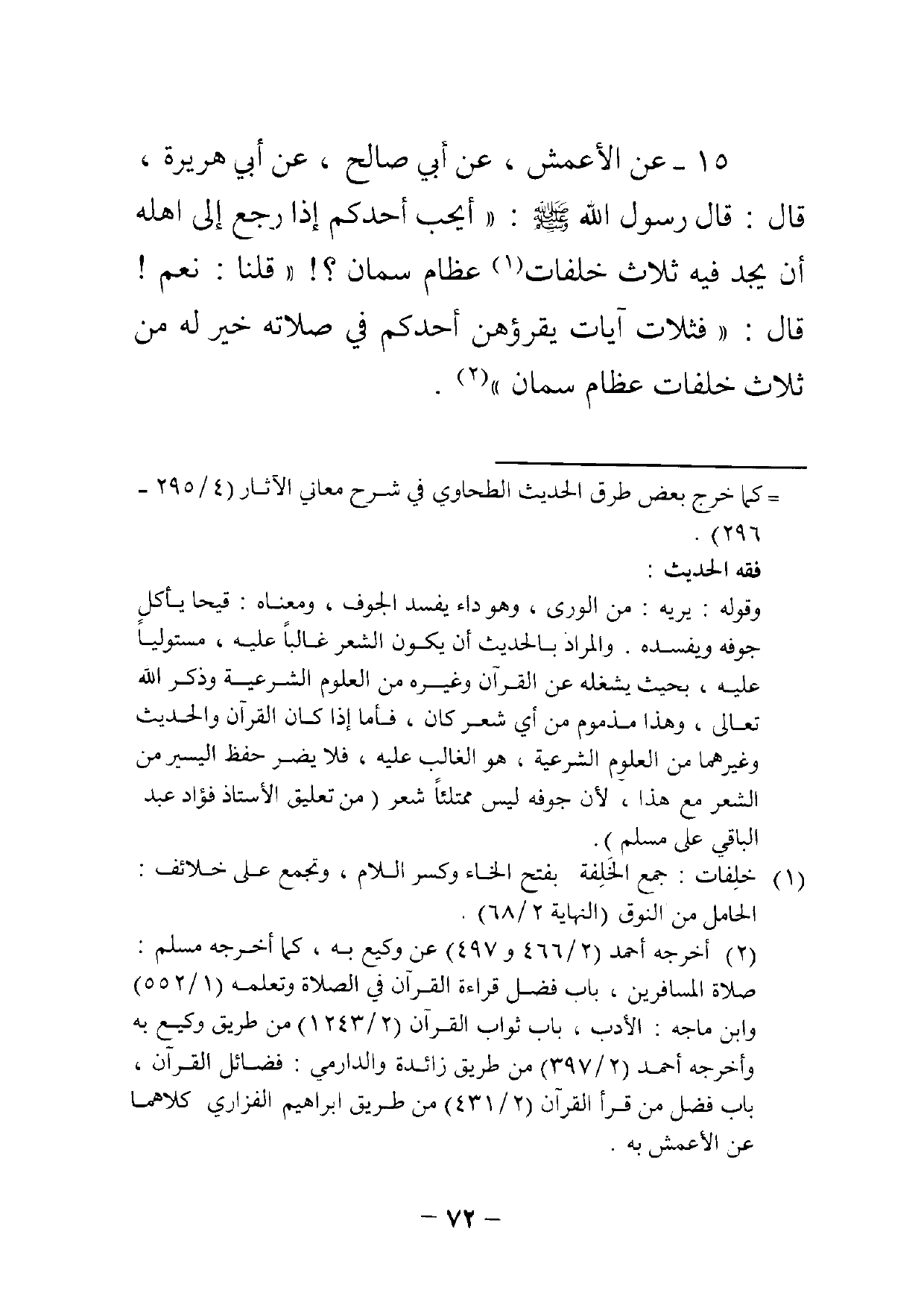 ١٥ - عَنِ الْأَعْمَشِ، عَنْ أَبِي صَالِحٍ، عَنْ أَبِي هُرَيْرَةَ، قَالَ: قَالَ رَسُولُ اللَّهِ صَلَّى اللَّهُ عَلَيْهِ وَسَلَّمَ: «أَيُحِبُّ أَحَدُكُمْ إِذَا رَجَعَ إِلَى أَهْلِهِ أَنْ يَجِدَ فِيهِ ثَلَاثَ خَلِفَاتٍ عِظَامٍ سِمَانٍ؟» قُلْنَا: نَعَمْ قَالَ: «فَثَلَاثُ آيَاتٍ، يَقْرَؤُهُنَّ أَحَدُكُمْ فِي صَلَاتِهِ خَيْرٌ لَهُ مِنْ ثَلَاثِ خَلِفَاتٍ عِظَامٍ سِمَانٍ»