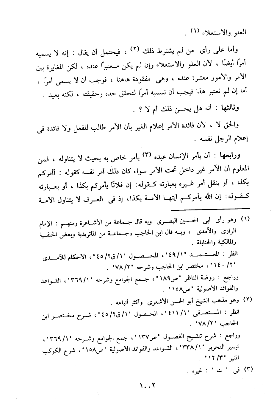 وأما على رأي من لم يشترط ذلك، فيحتمل أن يقال: إنه لا يسميه أمرًا أيضًا، لأن العلو والاستعلاء وإن لم يكن معتبرًا عنده، لكن المغايرة بين الأمر والأمور معتبرة عنده، وهي مفقودة هاهنا، فوجب أن لا يسمي أمرًا، أما إن لم نعتبر هذا فيجب أن نسميه أمرًا لتحقق حده وحقيقته، لكنه بعيد.
