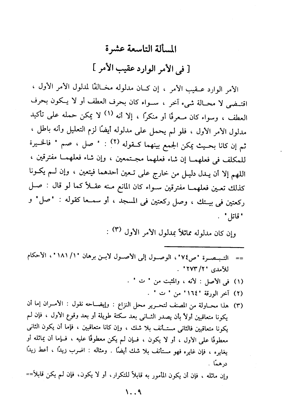 الأمر الوارد عقيب الأمر، إن كان مدلوله مخالفًا لمدلول الأمر الأول، اقتضى لا محالة شيء آخر، سواء كان بحرف العطف أو لا يكون بحرف العطف، وسواء كان معرفًا أو منكرًا، إلا أنه لا يمكن حمله على تأكيد مدلول الأمر الأول، فلو لم يحمل على مدلوله أيضًا لزم التعليل وأنه باطل، ثم إن كانا بحيث يمكن الجمع بينهما كقوله: "صل، صم" فالخيرة للمكلف في فعلهما إن شاء فعلهما مجتمعين، وإن شاء فعلهما مفترقين، اللهم إلا أن يدل دليل من خارج على تعين أحدهما فيتعين، وإن لم يكونا كذلك تعين فعلهما مفترقين سواء كان المانع منه عقلاً كما لو قال: صل ركعتين في بيتك، وصل ركعتين في المسجد، أو سمعا كقوله: "صل" و "قاتل".