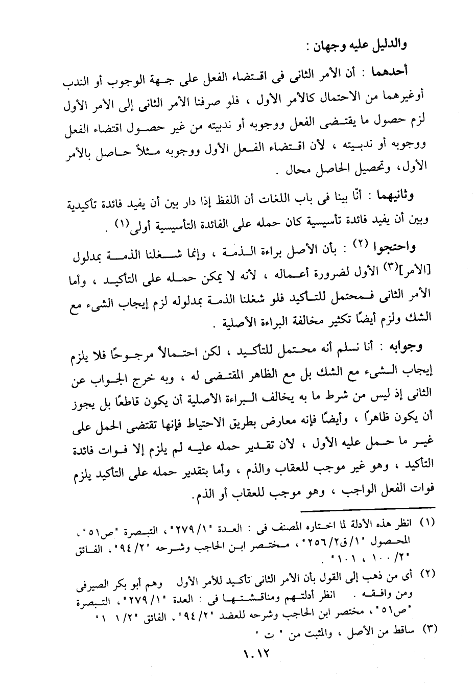 وجوابه: أنا نسلم أنه محتمل للتأكيد، لكن احتمالاً مرجوحًا فلا يلزم إيجاب الشيء مع الشك بل مع الظاهر المقتضي له، وبه خرج الجواب عن الثاني إذ ليس من شرط ما به يخالف البراءة الأصلية أن يكون قاطعًا بل يجوز أن يكون ظاهرًا، وأيضًا فإنه معارض بطريق الاحتياط فإنها تقتضي الحمل على غير ما حمل عليه الأول، لأن تقدير حمله عليه لم يلزم إلا فوات فائدة التأكيد، وهو غير موجب للعقاب والذم، وأما بتقدير حمله على التأكيد يلزم فوات الفعل الواجب، وهو موجب للعقاب أو الذم.