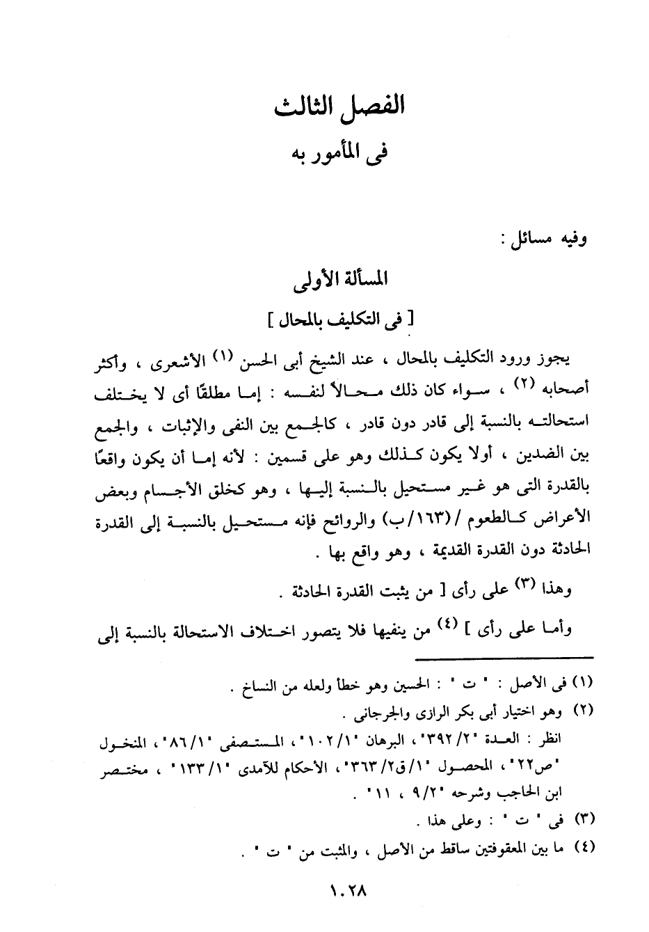 يجوز ورود التكليف بالمحال، عند الشيخ أبي الحسن الأشعري، وأكثر أصحابه، سواء كان ذلك محالاً لنفسه: إما مطلقًا أي لا يختلف استحالته بالنسبة إلى قادر دون قادر، كالجمع بين النفي والإثبات، والجمع بين الضدين، أو لا يكون كذلك وهو على قسمين: لأنه إما أن يكون واقعًا بالقدرة التي هو غير مستحيل بالنسبة إليها، وهو كخلق الأجسام وبعض الأعراض كالطعوم / (163/ب) والروائح فإنه مستحيل بالنسبة إلى القدرة الحادثة دون القدرة القديمة، وهو واقع بها.