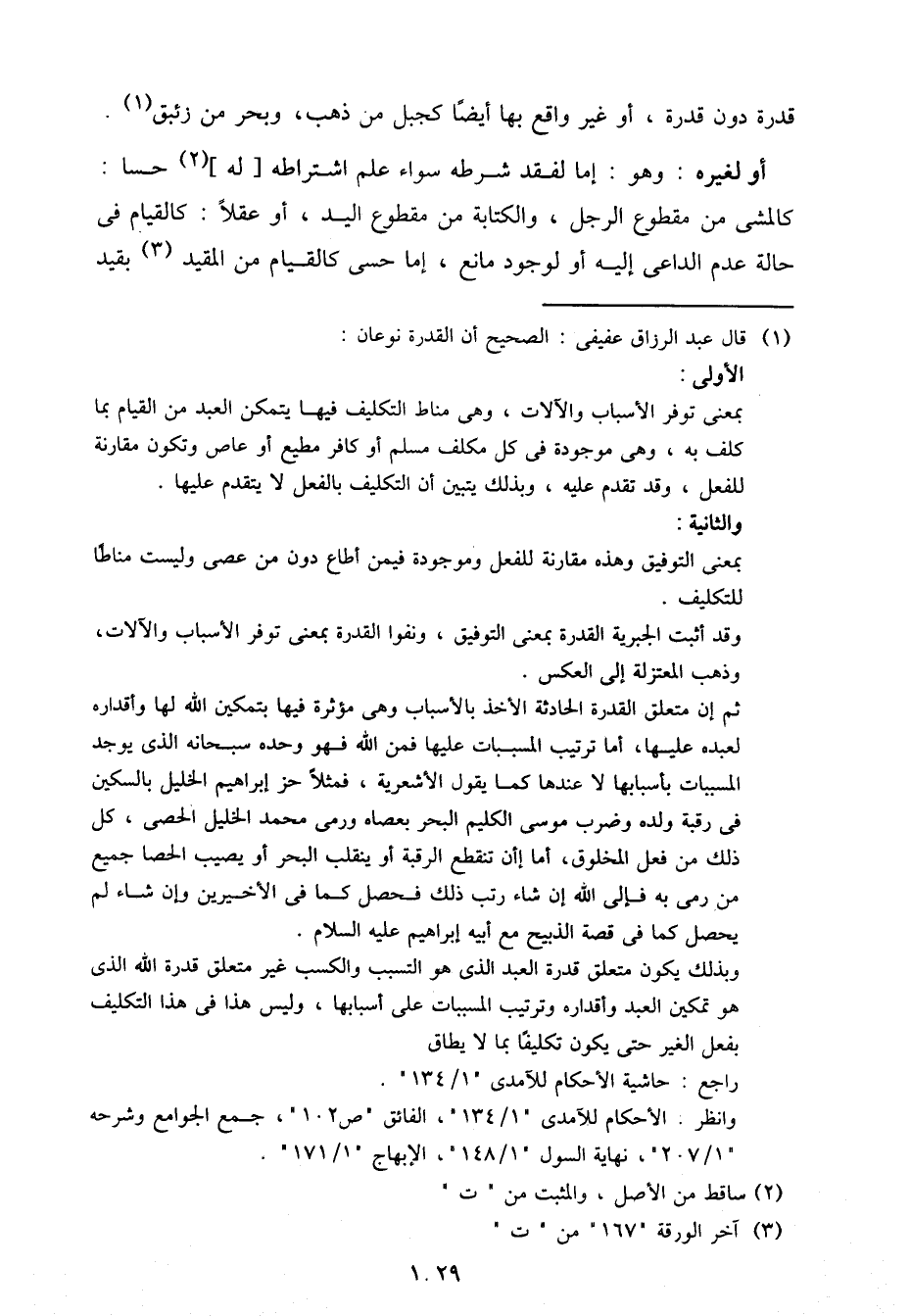 أو لغيره: وهو: إما لفقد شرطه سواء علم اشتراطه [له] حسا: كالمشي من مقطوع الرجل، والكتابة من مقطوع اليد، أو عقلاً، كالقيام في حالة عدم الداعي إليه أو لوجود مانع، إما حسي كالقيام من المقيد بقيد