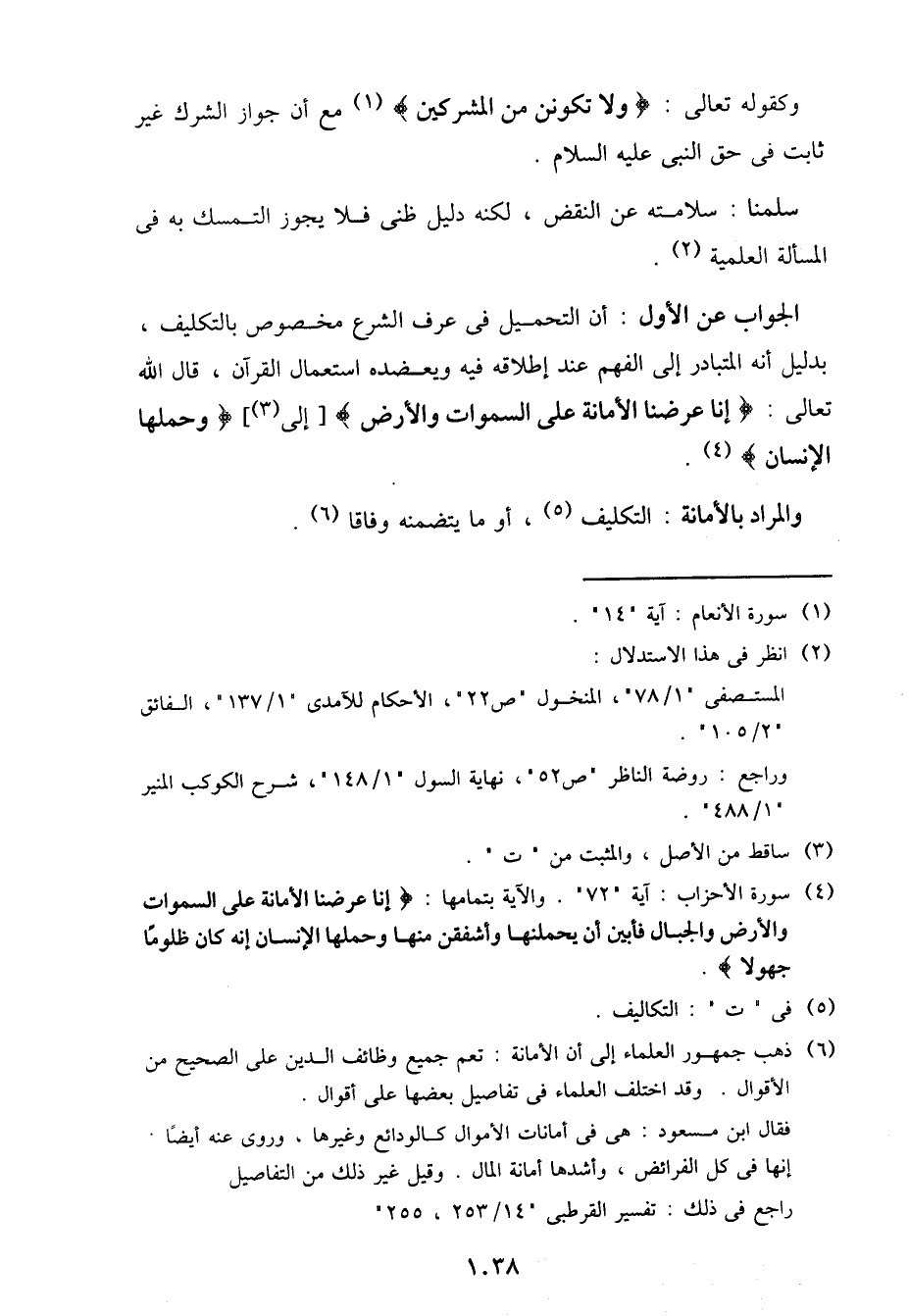 الجواب عن الأول: أن التحميل في عرف الشرع مخصوص بالتكليف، بدليل أنه المتبادر إلى الفهم عند إطلاقه فيه ويعضده استعمال القرآن، قال الله تعالى: {إنا عرضنا الأمانة على السموات والأرض} [إلى] {وحملها الإنسان}.