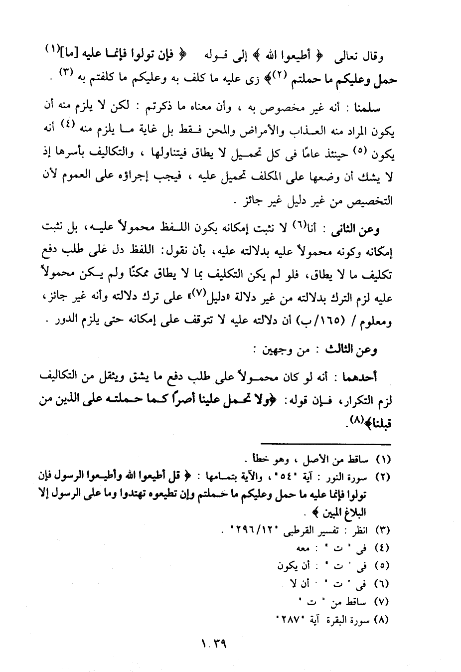 وقال تعالى {أطيعوا الله} إلى قوله {فإن تولوا فإنما عليه [ما] حمل وعليكم ما حملتم} زى عليه ما كلف به وعليكم ما كلفتم به.
