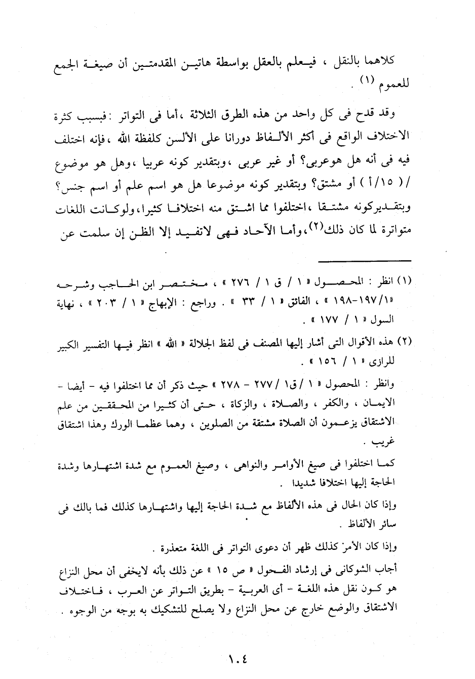 وقد قدح في كل واحد من هذه الطرق الثلاثة، أما في التواتر: فبسبب كثرة الاختلاف الواقع في أكثر الألفاظ دورانا على الألسن كلفظة الله، فإنه اختلف فيه في أنه هل هو عربي؟ أو غير عربي، وبتقدير كونه عربيا، وهل هو موضوع/ (15/أ) أو مشتق؟ وبتقدير كونه موضوعا هل هو اسم علم أو اسم جنس؟ وبتقدير كونه مشتقا، اختلفوا مما اشتق منه اختلافا كثيرا، ولو كانت اللغات متواترة لما كان ذلك، وأما الآحاد فهي لا تفيد إلا الظن إن سلمت عن