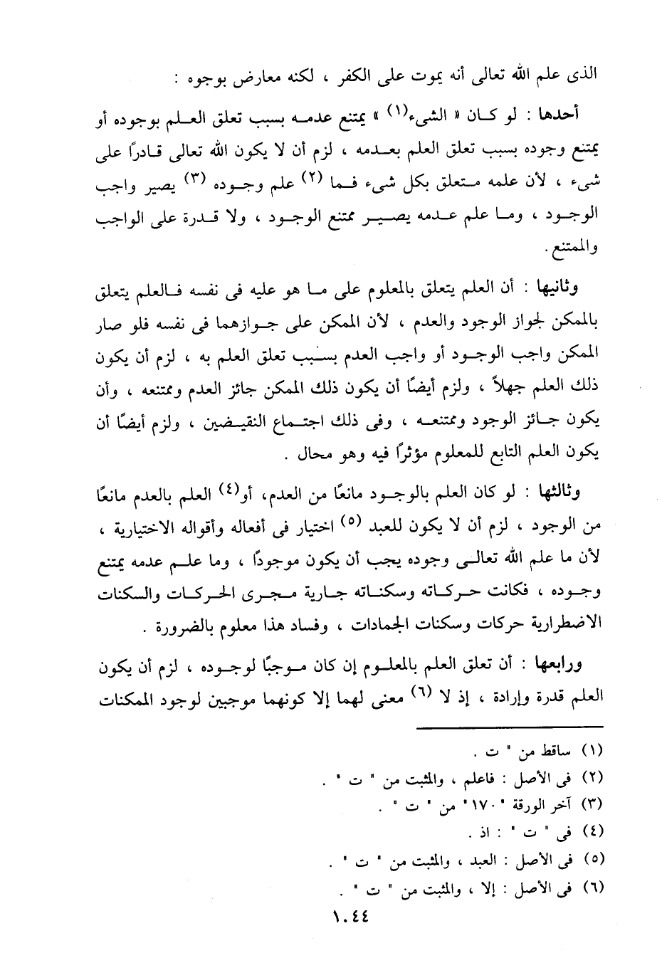 أحدها: لو كان "الشيء" يمتنع عدمه بسبب تعلق العلم بوجوده أو يمتنع وجوده بسبب تعلق العلم بعدمه، لزم أن لا يكون الله تعالى قادرًا على شيء، لأن علمه متعلق بكل شيء فما علم وجوده يصير واجب الوجود، وما علم عدمه يصير ممتنع الوجود، ولا قدرة على الواجب والممتنع.