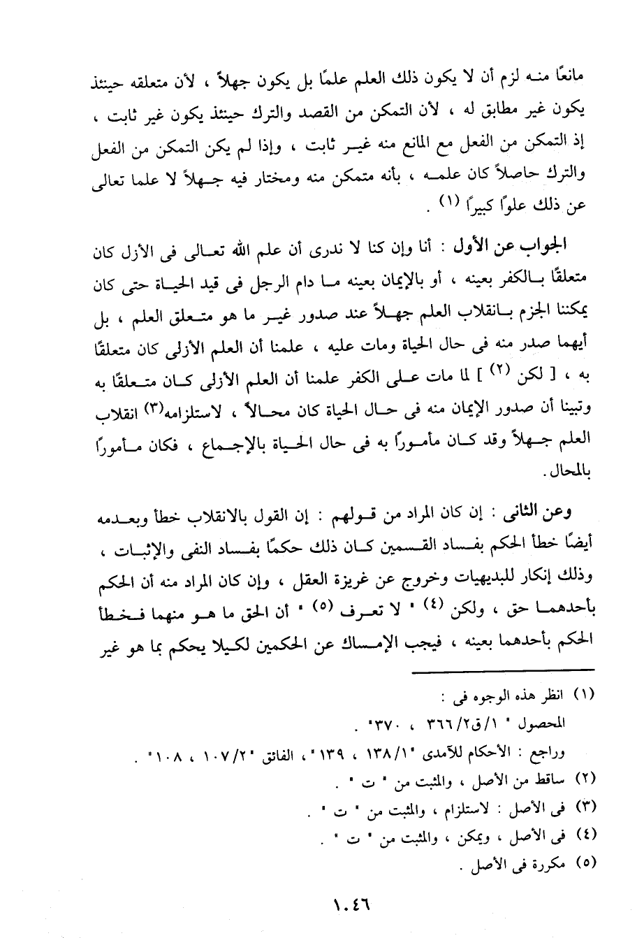 وعن الثاني: إن كان المراد من قولهم: إن القول بالانقلاب خطأ وبعدمه أيضًا خطأ الحكم بفساد القسمين كان ذلك حكمًا بفساد النفي والإثبات، وذلك إنكار للبديهيات وخروج عن غريزة العقل، وإن كان المراد منه أن الحكم بأحدهما حق، ولكن "لا تعرف" أن الحق ما هو منهما فخطأ الحكم بأحدهما بعينه، فيجب الإمساك عن الحكمين لكيلا يحكم بما هو غير