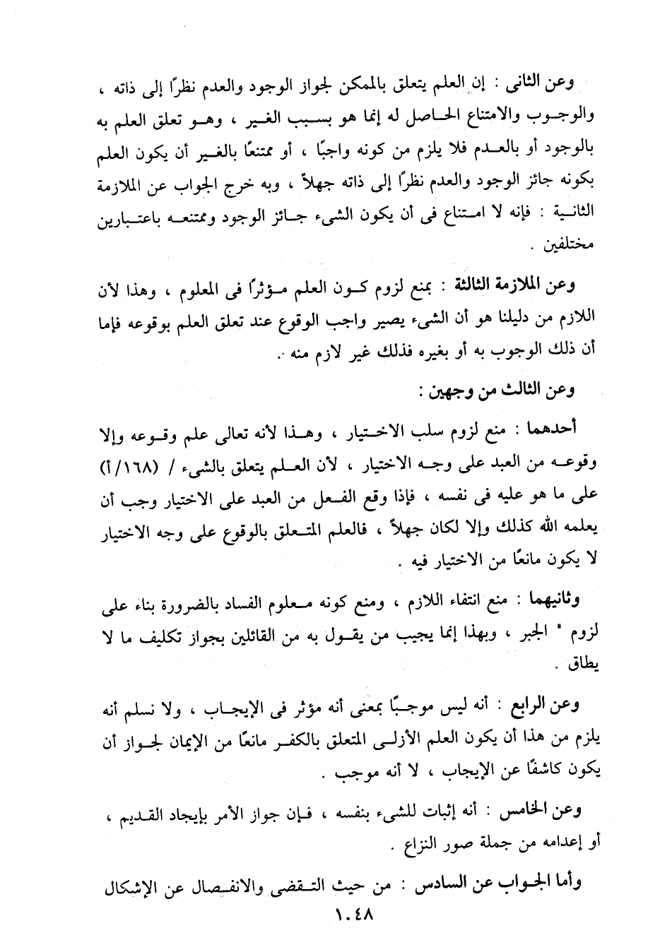 وعن الثاني: إن العلم يتعلق بالممكن لجواز الوجود والعدم نظرًا إلى ذاته، والوجوب والامتناع الحاصل له إنما هو بسبب الغير، وهو تعلق العلم به بالوجود أو بالعدم فلا يلزم من كونه واجبًا، أو ممتنعًا بالغير أن يكون العلم بكونه جائز الوجود والعدم نظرًا إلى ذاته جهلاً، وبه خرج الجواب عن الملازمة الثانية: فإنه لا امتناع في أن يكون الشيء جائز الوجود وممتنعة باعتبارين مختلفين.