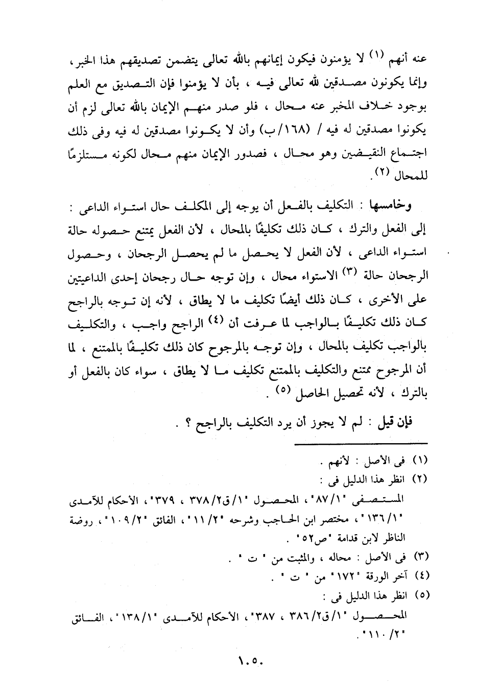 وخامسها: التكليف بالفعل أن يوجه إلى المكلف حال استواء الداعي: إلى الفعل والترك، كان ذلك تكليفًا بالمحال، لأن الفعل يمتنع حصوله حالة استواء الداعي، لأن الفعل لا يحصل ما لم يحصل الرجحا، وحصول الرجحان حالة الاستواء محال، وإن توجه حال رجحان إحدى الداعيتين على الأخرى، كان ذلك أيضًا تكليف ما لا يطاق، لأنه إن توجه بالراجح كان ذلك تكليفًا بالواجب لما عرفت أن الراجح واجب، والتكليف بالواجب تكليف بالمحال، وإن توجه بالمرجوح كان ذلك تكليفًا بالممتنع، لما أن المرجوح ممتنع والتكليف بالممتنع تكليف ما لا يطاق، سواء كان بالفعل أو بالترك، لأنه تحصيل الحاصل.
