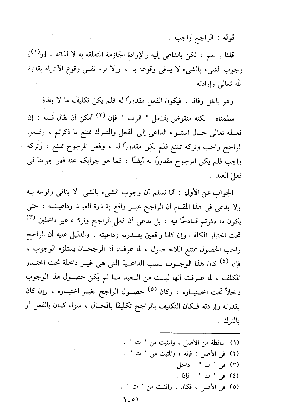 الجواب عن الأول: أنا نسلم أن وجوب الشيء بالشيء لا ينافي وقوعه به ولا يدعى في هذا المقام أن الراجح غير واقع بقدرة العبد وداعيته، حتى يكون ما ذكرتم قادحًا فيه، بل ندعى أن فعل الراجح وتركه غير داخلين تحت اختيار المكلف وإن كانا واقعين بقدرته وداعيته، والدليل عليه أن الراجح واجب الحصول ممتنع اللاحصول، لما عرفت أن الرجحان يستلزم الوجوب، فإن كان هذا الوجوب بسبب الداعية التي هي غير داخلة تحت اختيار المكلف، لما عرفت أنها ليست من العبد ما لم يكن حصول هذا الوجوب داخلاً تحت اختياره، وكان حصول الراجح بغير اختياره، وإن كان بقدرته وإرادته فكان التكليف بالراجح تكليفًا بالمحال، سواء كان بالفعل أو بالترك.