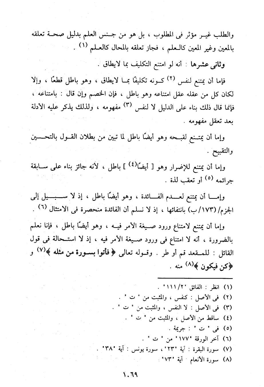 وإما أن يمتنع لامتناع ورود صيغة الأمر فيه، وهو أيضًا باطل، فإنا نعلم بالضرورة، أنه لا امتناع في ورود صيغة الأمر فيه، إذ لا استحالة في قول القائل: للمقعد قم أو طر. وقوله تعالى {فأتوا بسورة من مثله} و {كن فيكون {منه.