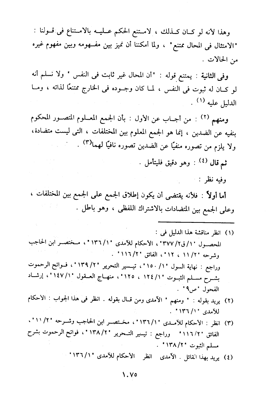 ومنهم: من أجاب عن الأول: بأن الجمع المعلوم المتصور المحكوم بنفيه عن الضدين، إنما هو الجمع المعلوم بين المتخلفات، التي ليست متضادة، ولا يلزم من تصوره منفيًا عن الضدين تصوره نافيًا لهما.