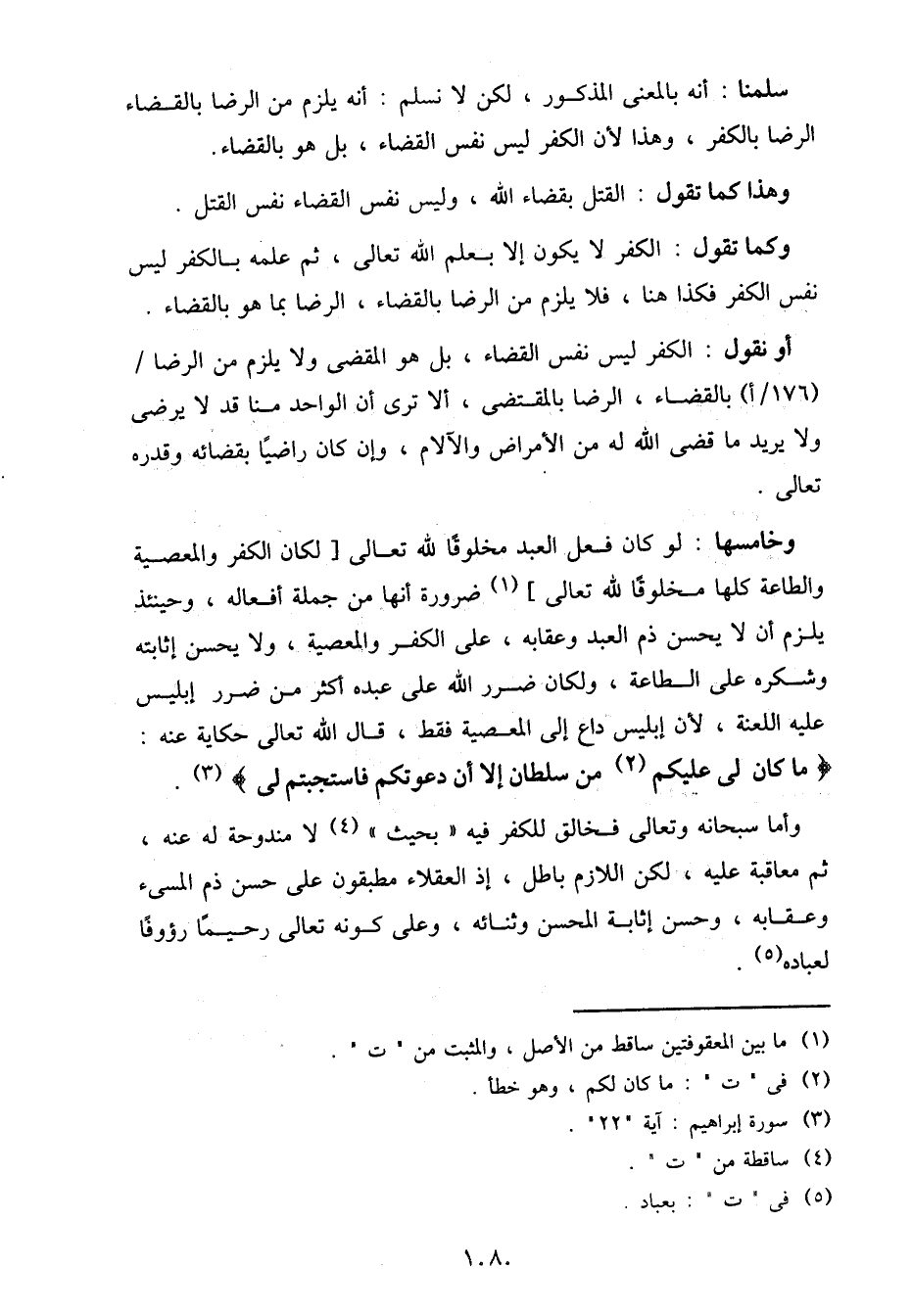 أو نقول: الكفر ليس نفس القضاء، بل هو المقضي ولا يلزم من الرضا / (176/أ) بالقضاء، الرضا بالمقتضي، ألا ترى أن الواحد منا قد لا يرضي ولا يريد ما قضي الله له من الأمراض والآلام، وإن كان راضيًا بقضائه وقدره تعالى.