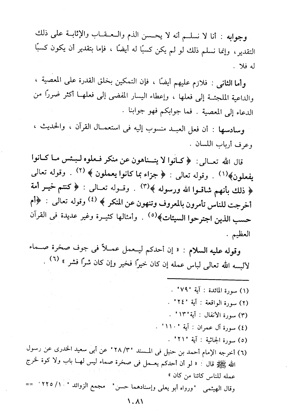 قال الله تعالى: {كانوا لا يتناهون عن منكر فعلوه لبئس ما كانوا يفعلون}. وقوله تعالى: {جزاء بما كانوا يعملون}. وقوله تعالى {ذلك بأنهم شاقوا الله ورسوله}. وقوله تعالى: {كنتم خير أمة أخرجت للناس تأمرون بالمعروف وتنهون عن المنكر} وقوله تعالى: {أم حسب الذين اجترحوا السيئات}. وأمثالها كثيرة وغير عديدة في القرآن العظيم.