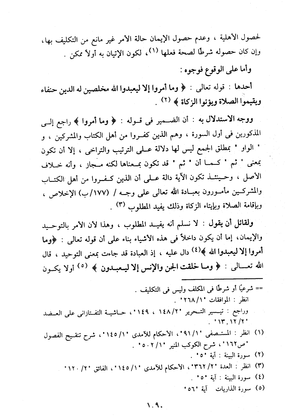 ووجه الاستدلال به: أن الضمير في قوله: {وما أمروا} راجع إلى المذكورين في أول السورة، وهم الذين كفروا من أهل الكتاب والمشركين، و "الواو" بمطلق الجمع ليس لها دلالة على الترتيب والتراخي، إلا أن تكون بمعني "ثم" كما أن "ثم" قد تكون بمعناها لكنه مجاز، وأنه خلاف الأصل، وحينئذ تكون الآية دالة على أن الذين كفروا من أهل الكتاب والمشركين مأمورون بعبادة الله تعالى على وجه / (177/ب) الإخلاص، وبإقامة الصلاة وبإيتاء الزكاة وذلك يفيد المطلوب.