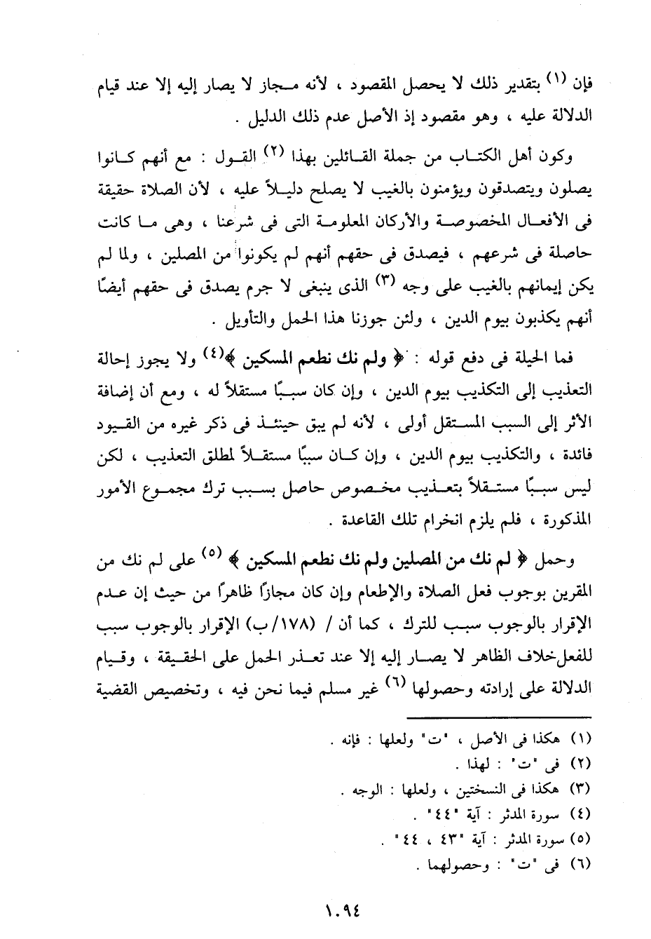 وحمل {لم نك من المصلين ولم نك نطعم المسكين} على لم نك من المقرين بوجوب فعل الصلاة والإطعام وإن كان مجازًا ظاهرًا من حيث إن عدم الإقرار بالوجوب سبب للترك، كما أن / (178/ب) الإقرار بالوجوب سبب للفعل خلاف الظاهر لا يصار إليه إلا عند تعذر الحمل على الحقيقة، وقيام الدلالة على إرادته وحصولها غير مسلم فيما نحن فيه، وتخصيص القضية