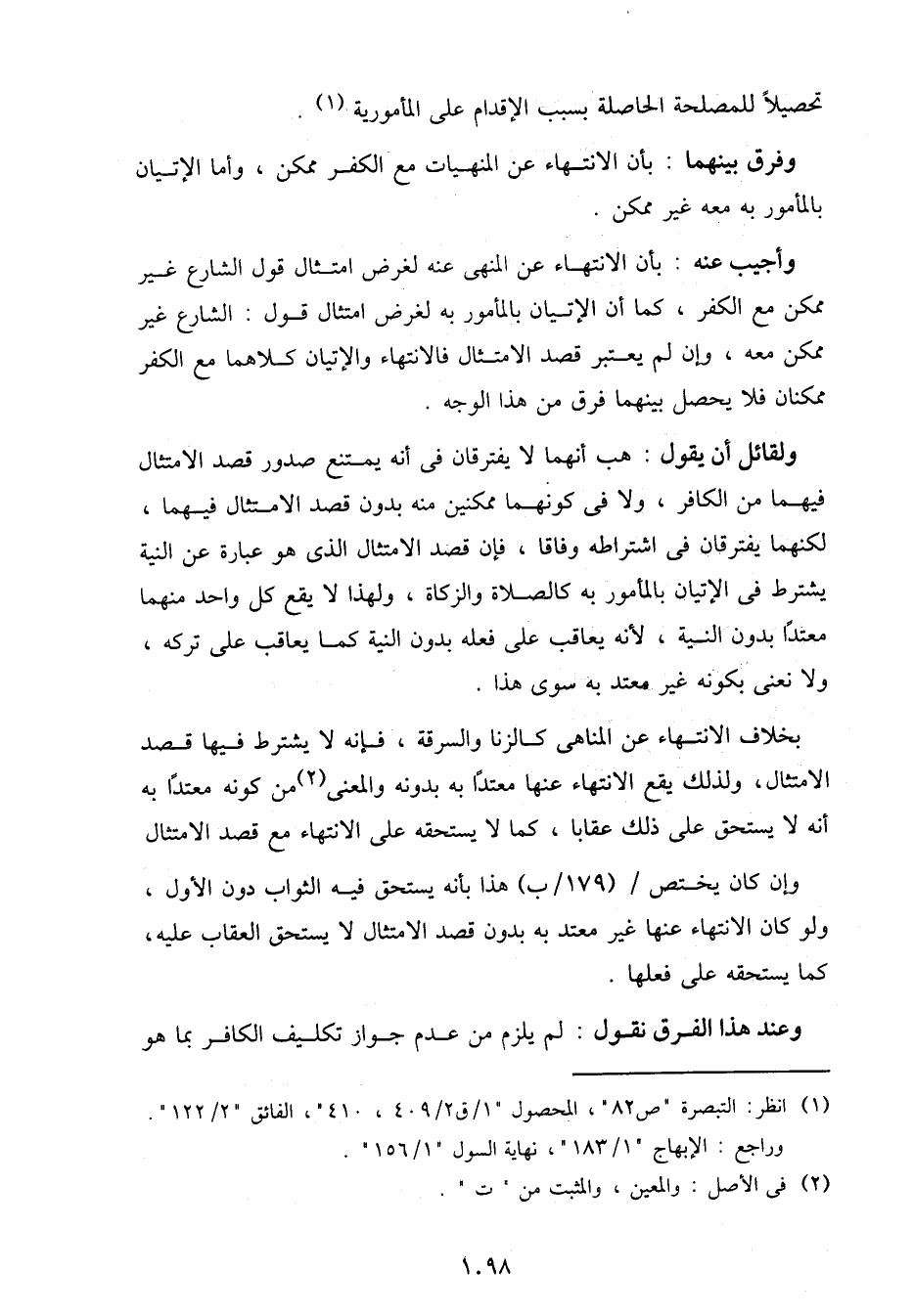 ولقائل أن يقول: هب أنهما لا يفترقان في انه يمتنع صدور قصد الامتثال فيهما من الكافر، ولا في كونهما ممكنين منه بدون قصد الامتثال فيهما، لكنهما يفترقان في اشتراطه وفاقا، فإن قصد الامتثال الذي هو عبارة عن النية يشترط في الإتيان بالمأمور به كالصلاة والزكاة، ولهذا لا يقع كل واحد منهما معتدًا بدون النية، لأنه يعاقب على فعله بدون النية كما يعاقب على تركه، ولا نعني بكونه غير معتد به سوى هذا.