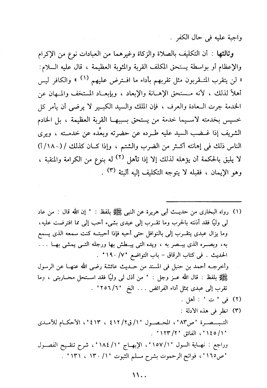 وثالثها: أن التكليف بالصلاة والزكاة وغيرهما من العبادات نوع من الإكرام والإعظام أو بواسطة يستحق المكلف القربة والمثوبة العظيمة، قال عليه السلام: "لن يتقرب المتقربون مثل تقربهم بأداء ما افترض عليهم" والكافر ليس أهلاً لذلك، لأنه مستحق الإهانة والإبعاد، وبإبعاد المستخف والمهان عن الخدمة جرت العادة والعرف، فإن الملك والسيد الكبير لا يرضي أن يأمر كل خسيس بخدمته لاسيما خدمة من يستحق بسببها القربة العظيمة، بل الخادم الشريف إذا غضب السيد عليه طرده عن حضرته وبعده عن خدمته، ويرى الناس ذلك في إهانته أكثر من الضرب والشتم، وإذا كان كذلك / (180/أ) لا يليق بالحكمة أن يؤهله لذلك إلا إذا تأهل له بنوع من الكرامة والمنقبة، وهو الإيمان، فقبله لا يتوجه التكليف إليه ألبتة.