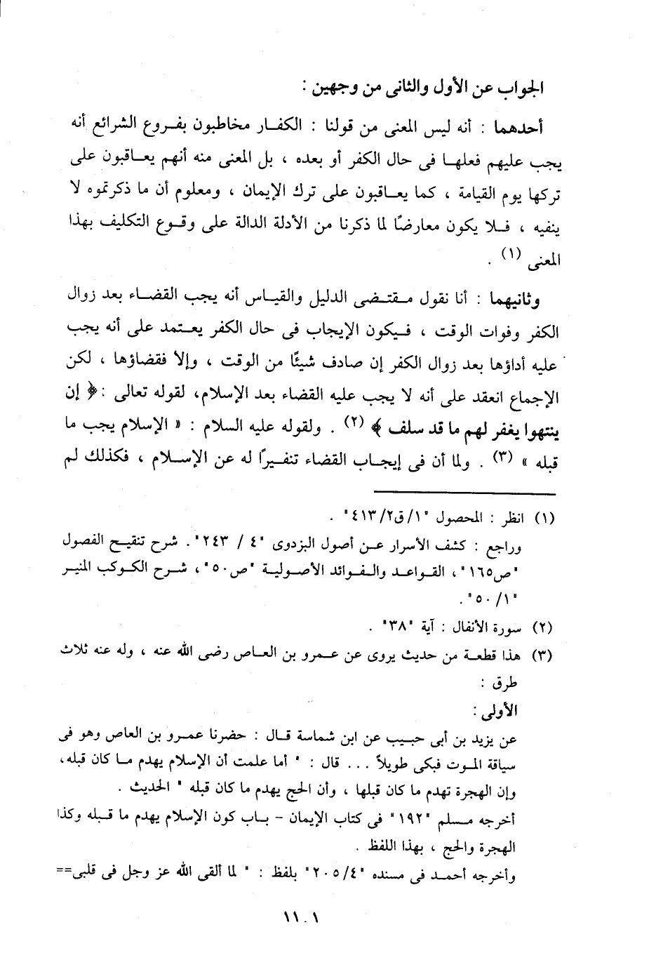 وثانيهما: أنا نقول مقتضى الدليل والقياس أنه يجب القضاء بعد زوال الكفر وفوات الوقت، فيكون الإيجاب في حال الكفر يعتمد على أنه يجب عليه أداؤها بعد زوال الكفر إن صادف شيئًا من الوقت، وإلا فقضاؤها، لكن الإجماع انعقد على أنه لا يجب عليه القضاء بعد الإسلام، لقوله تعالى: {إن ينتهوا يغفر لهم ما قد سلف}. ولقوله عليه السلام: "الإسلام يجب ما قبله". ولما أن في إيجاب القضاء تنفيرًا له عن الإسلام، فكذلك لم