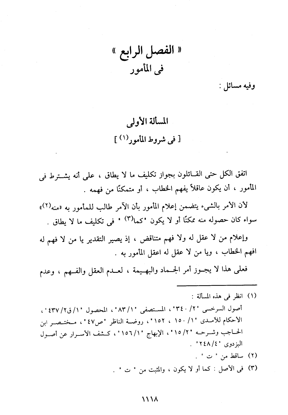 اتفق الكل حتى القائلون بجواز تكليف ما لا يطاق، على أنه يشترط في المأمور، أن يكون عاقلاً يفهم الخطاب، أو متمكنًا من فهمه.