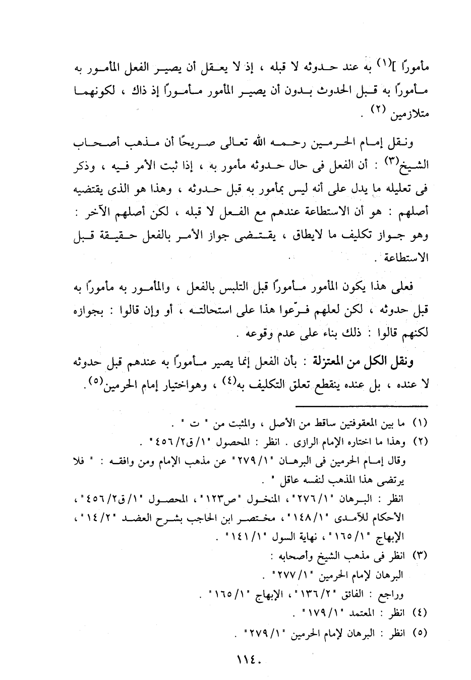 ونقل إمام الحرمين رحمه الله تعالى صريحًا أن مذهب أصحاب الشيخ: أن الفعل في حال حدوثه مأمور به، إذا ثبت الأمر فيه، وذكر في تعليله ما يدل على أنه ليس بمأمور به قبل حدوثه، وهذا هو الذي يقتضيه أصلهم: هو أن الاستطاعة عندهم مع الفعل لا قبله، لكن أصلهم الآخر: وهو جواز تكليف ما لا يطاق، يقتضي جواز الأمر بالفعل حقيقة قبل الاستطاعة.