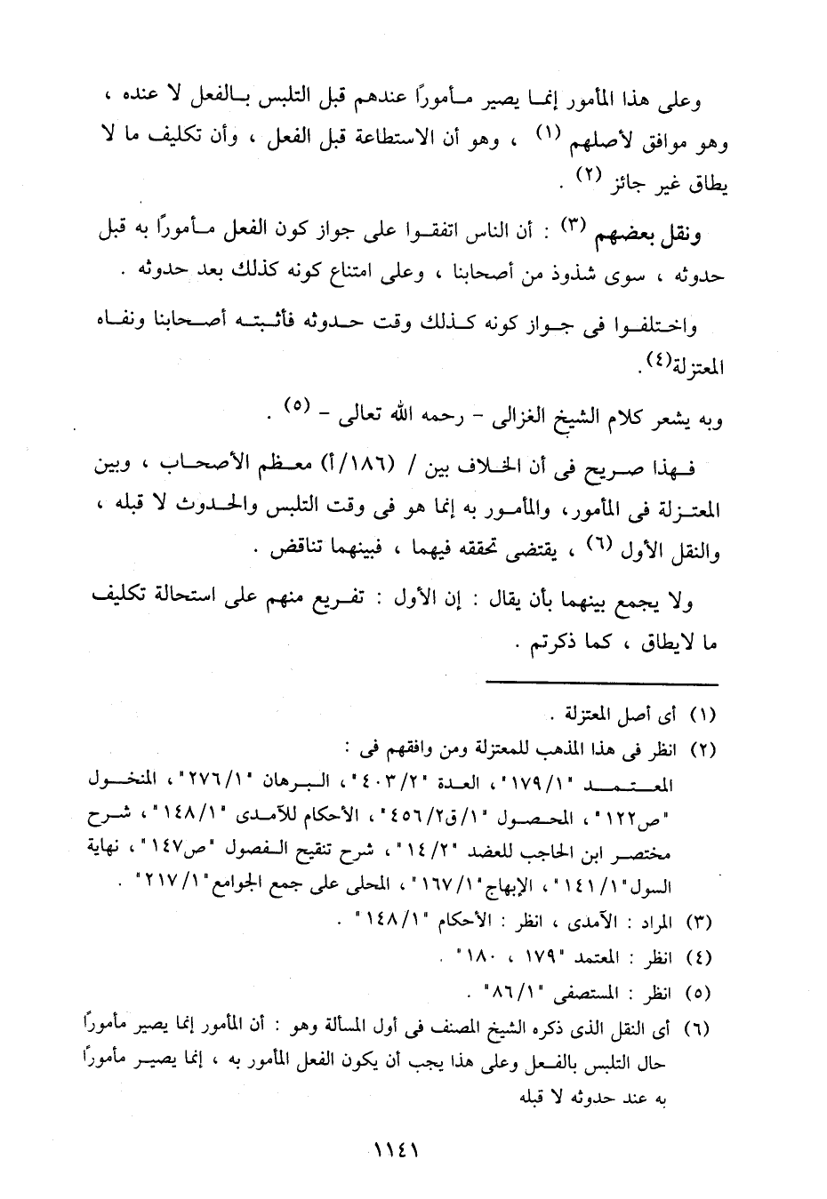 فهذا صريح في أن الخلاف بين / (186/أ) معظم الأصحاب، وبين المعتزلة في المأمور، والمأمور به إنما هو في وقت التلبس والحدوث لا قبله، والنقل الأول، يقتضي تحققه فيهما، فبينهما تناقض.