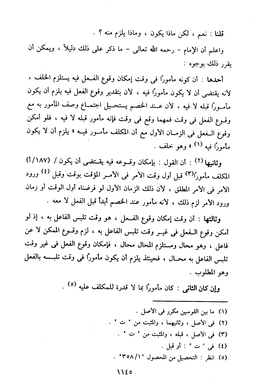 وثالثها: أن وقت إمكان وقوع الفعل، هو وقت تلبس الفاعل به، إذ لو أمكن وقوع الفعل في غير وقت تلبس الفاعل به، لزم وقوع الممكن لا عن فاعل، وهو محال ومستلزم المحال محال، فإمكان وقوع الفعل في غير وقت تلبس الفاعل به محال، فحينئذ يلزم أن يكون مأمورًا في وقت تلبسه بالفعل وهو المطلوب.