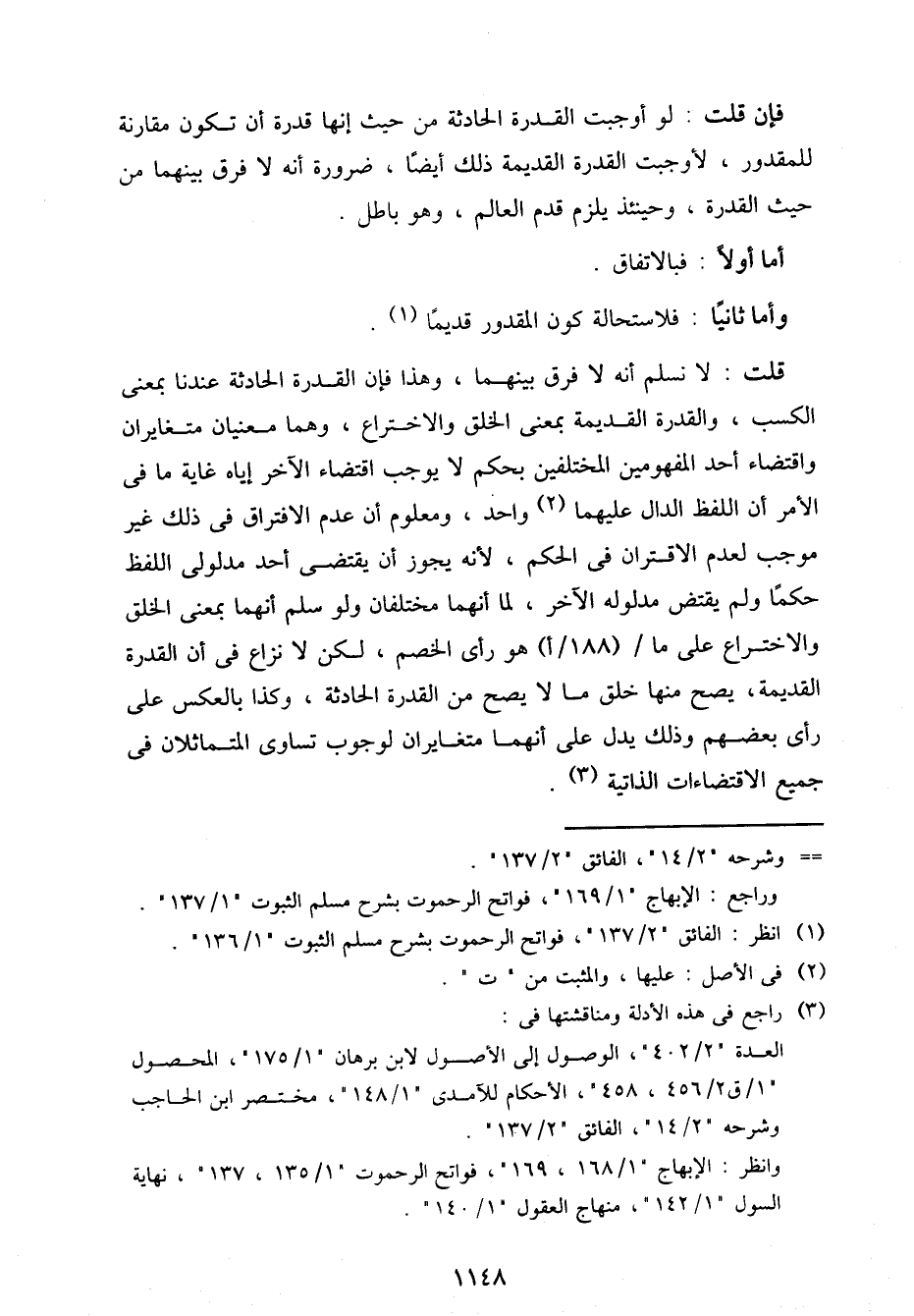 فإن قلت: لو أوجبت القدرة الحادثة من حيث إنها قدرة أن تكون مقارنة للمقدور، لأوجبت القدرة القديمة ذلك أيضًا، ضرورة أنه لا فرق بينهما من حيث القدرة، وحينئذ يلزم قدم العالم، وهو باطل.