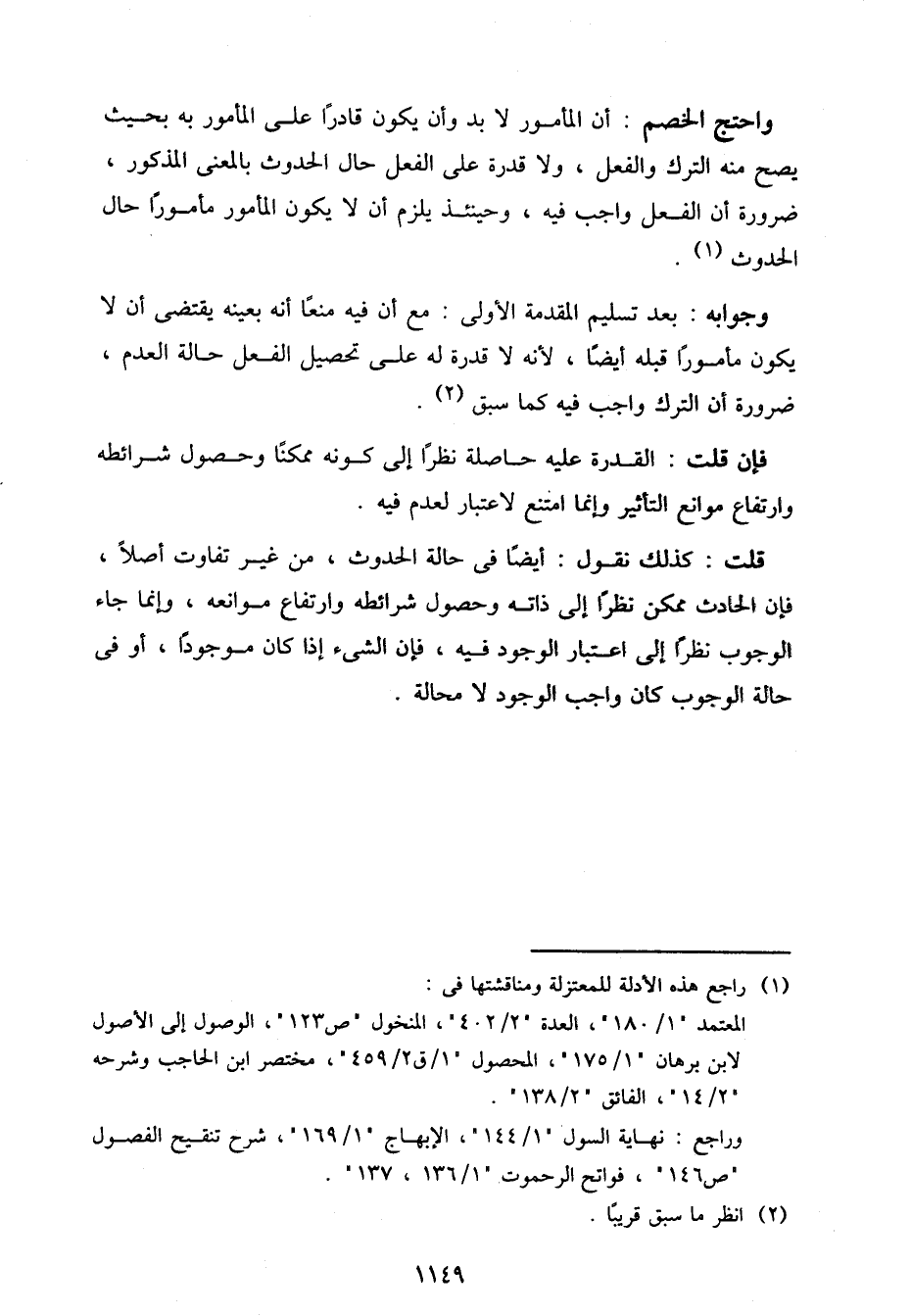 واحتج الخصم: أن المأمور لابد وأن يكون قادرًا على المأمور به بحيث يصح منه الترك والفعل، ولا قدرة على الفعل حال الحدوث بالمعني المذكور، ضرورة أن الفعل واجب فيه، وحينئذ يلزم أن لا يكون المأمور مأمورًا حال الحدوث.