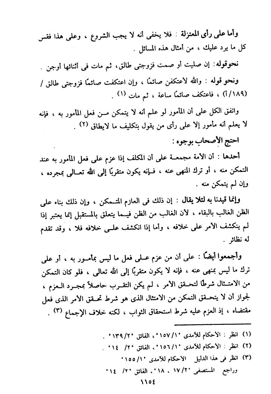 وأجمعوا أيضًا: على أن من عزم على فعل ما ليس بمأمور به، أو على ترك ما ليس بمنهي عنه، فإنه لا يكون متقربًا إلى الله تعالى، فلو كان التمكن من الامتثال شرطًا لتحقق الأمر، لم يكن التقرب حاصلاً بمجرد العزم، لجواز أن لا يتحقق التمكن من الامتثال الذي هو شرط تحقق الأمر الذي فعل مقتضاه، إذ العزم عليه شرط استحقاق الثواب، لكنه خلاف الإجماع.