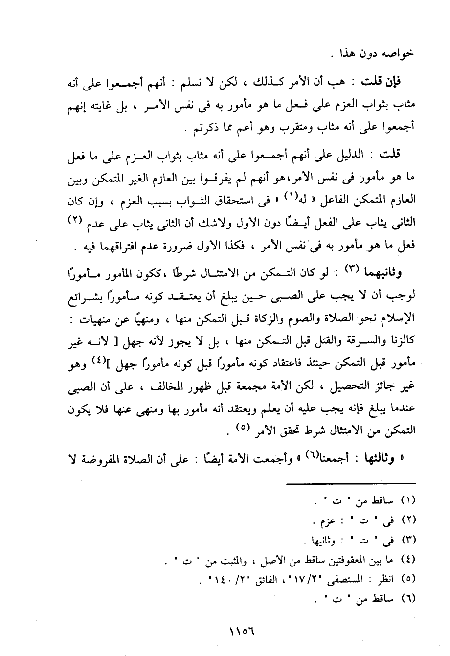 قلت: الدليل على أنهم أجمعوا على أنه مثاب بثواب العزم على ما فعل ما هو مأمور في نفس الأمر، هو أنهم لم يفرقوا بين العازم الغير المتمكن وبين العازم المتمكن الفاعل "له" في استحقاق الثواب بسبب العزم، وإن كان الثاني يثاب على الفعل أيضًا دون الأول ولا شك أن الثاني يثاب على عدم فعل ما هو مأمور به في نفس الأمر، فكذا الأول ضرورة عدم افتراقهما فيه.