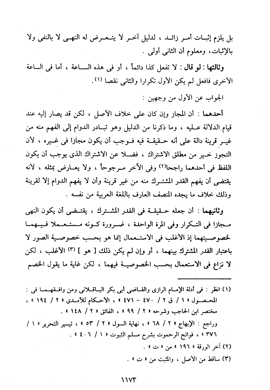 أحدهما: أن المجاز وإن كان على خلاف الأصل، لكن قد يصار إليه عند قيام الدلالة عليه، وما ذكرنا من الدليل وهو تبادر الدوام إلى الفهم منه من غير قرينة دالة على أنه حقيقة فيه فوجب أن يكون مجازا في غيره، لأن التجوز خير من مطلق الاشتراك، فضلا عن الاشتراك الذي يوجب أن يكون اللفظ في أحدهما راجحا وفي الآخر مرجوحًا، ولا يعارض بمثله، لأنه يقتضي أن يفهم القدر المشترك منه من غير قرينة وأن لا يفهم الدوام إلا لقرينة وذلك خلاف ما يجده المنصف العارف باللغة العربية من نفسه.