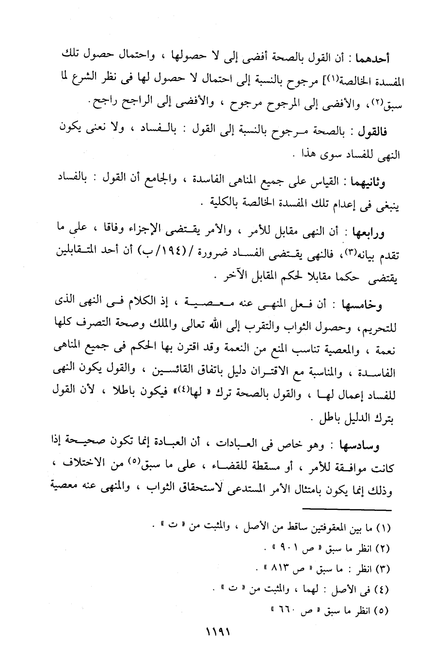 وخامسها: أن فعل المنهي عنه معصية، إذ الكلام في النهي الذي للتحريم، وحصول الثواب والتقرب إلى الله تعالى والملك وصحة التصرف كلها نعمة، والمعصية تناسب المنع من النعمة وقد اقترن بها الحكم في جميع المناهي الفاسدة، والمناسبة مع الاقتران دليل باتفاق القائسين، والقول يكون النهي للفساد إعمال لها، والقول بالصحة ترك "لها" فيكون باطلا، لأن القول بترك الدليل باطل.