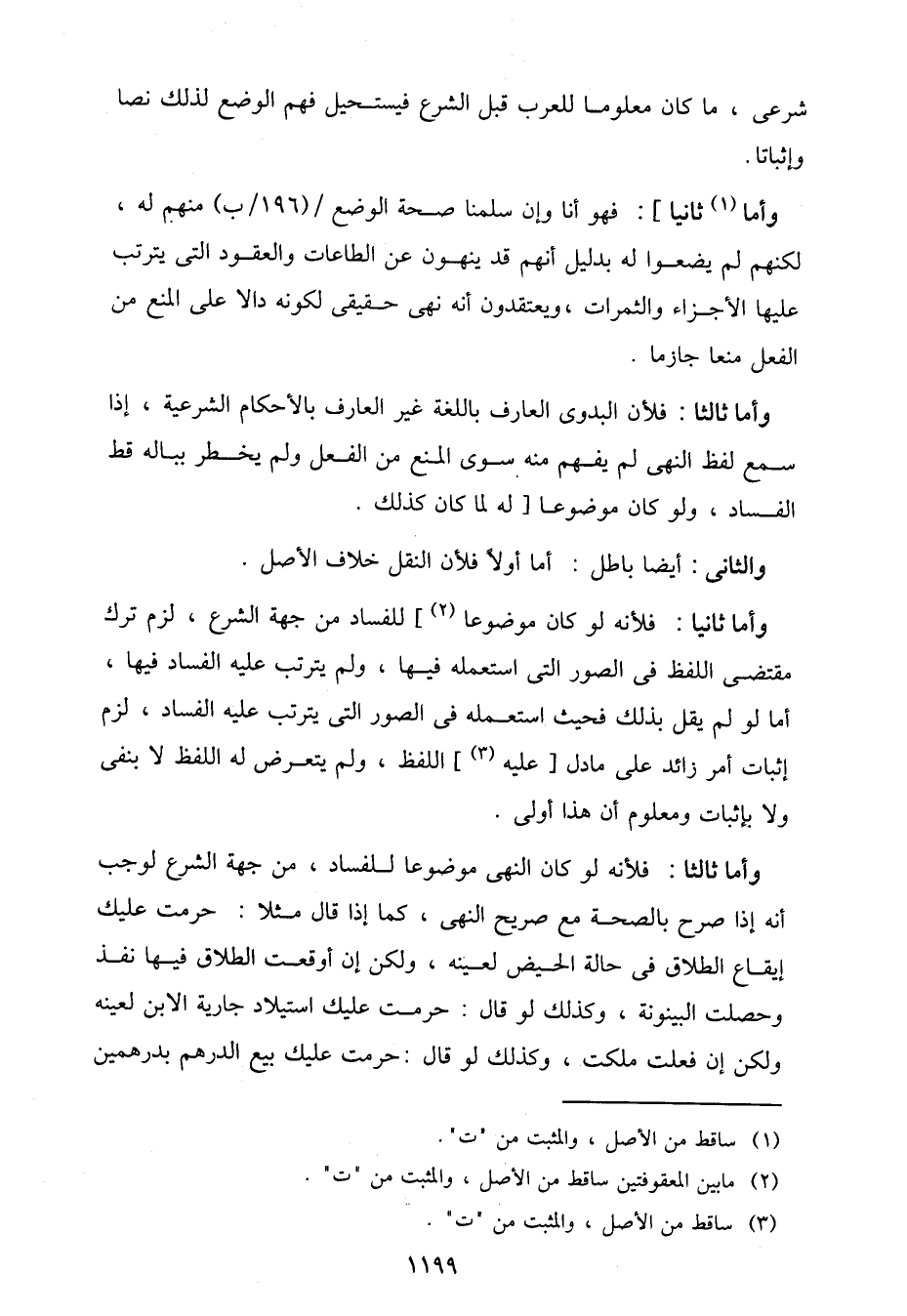 وأما ثانيا: فلأنه لو كان موضوعا] للفساد من جهة الشرع، لزم ترك مقتضي اللفظ في الصور التي استعمله فيها، ولم يترتب عليه الفساد فيها، أما لو لم يقل بذلك فحيث استعمله في الصور التي يترتب عليه الفساد، لزم إثبات أمر زائد على ما دل [عليه] اللفظ، ولم يتعرض له اللفظ لا بنفي ولا بإثبات ومعلوم أن هذا أولى.