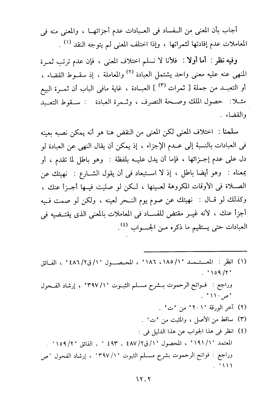 وفيه نظر: أما أولا: فلأنا لا نسلم اختلاف المعني، فإن عدم ترتب ثمرة المنهي عنه عليه معنى واحد يشتمل العبادة والمعاملة، إذ سقوط القضاء، أو التعبد من جملة [ثمرات] العبادة، غاية ما في الباب أن ثمرة البيع مثلا: حصول الملك وصحة التصرف، وثمرة العبادة: سقوط التعبد والقضاء.
