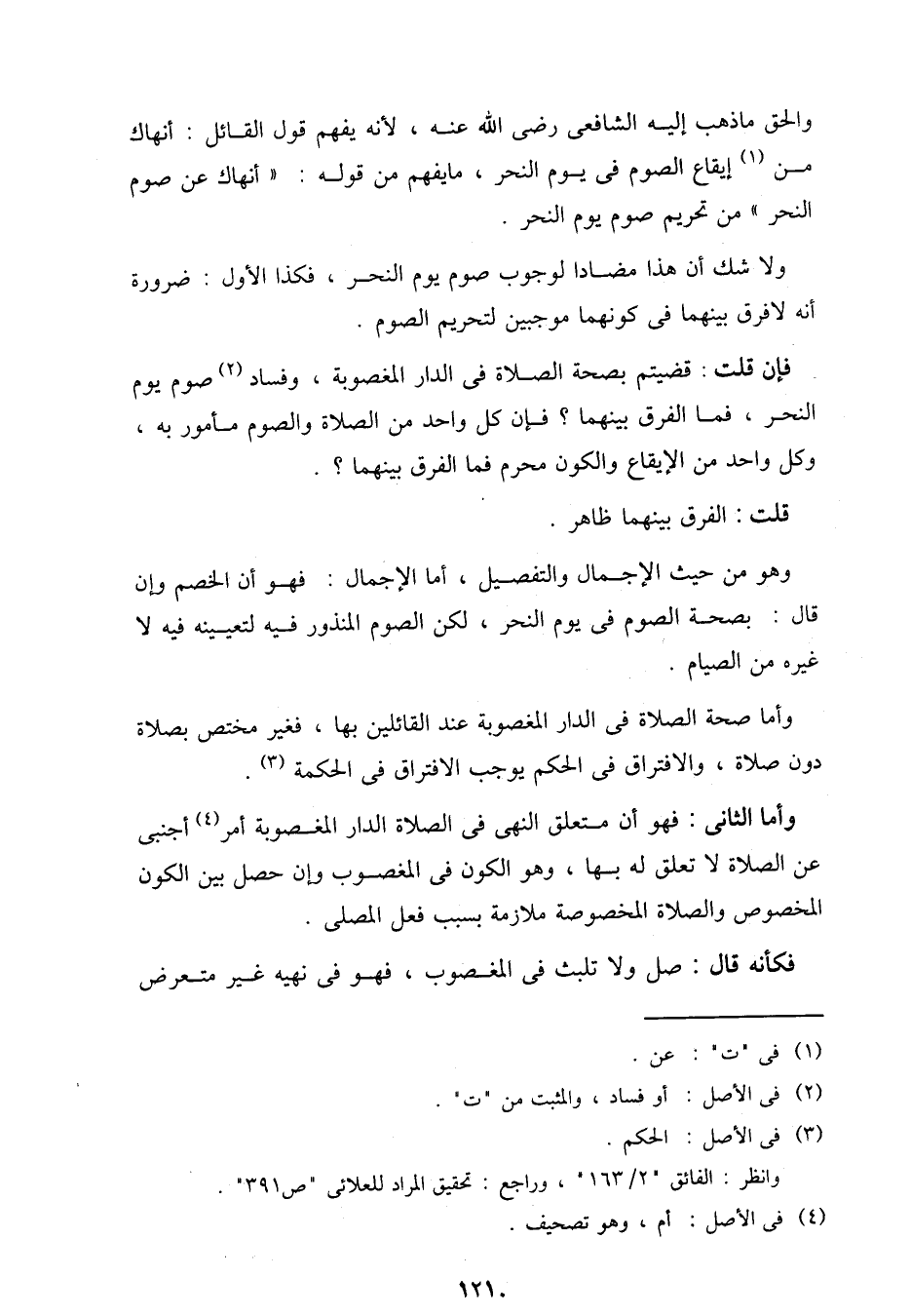 فإن قلت: قضيتم بصحة الصلاة في الدار المغصوبة، وفساد صوم يوم النحر، فما الفرق بينهما؟ فإن كل واحد من الصلاة والصوم مأمور به، وكل واحد من الإيقاع والكون محرم فما الفرق بينهما؟.