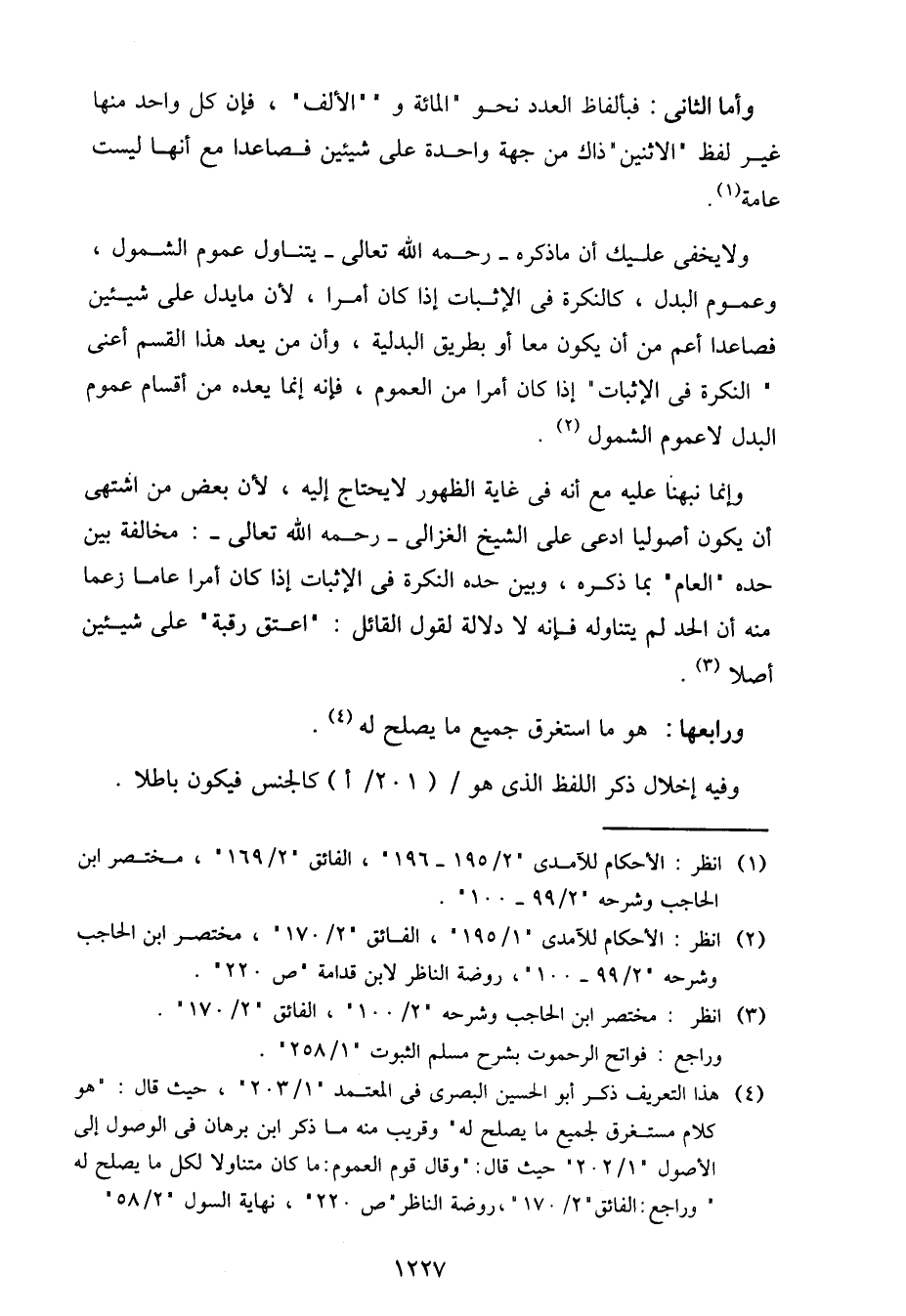 وإنما نبهنا عليه مع أنه في غاية الظهور لا يحتاج إليه، لأن بعض من اشتهي أن يكون أصوليا ادعى على الشيخ الغزالي - رحمه الله تعالى -: مخالفة بين حده "العام" بما ذكره، وبين حده النكرة في الإثبات إذا كان أمرا عاما زعما منه أن الحد لم يتناوله فإنه لا دلالة لقول القائل: "اعتق رقبة" على شيئين أصلا.