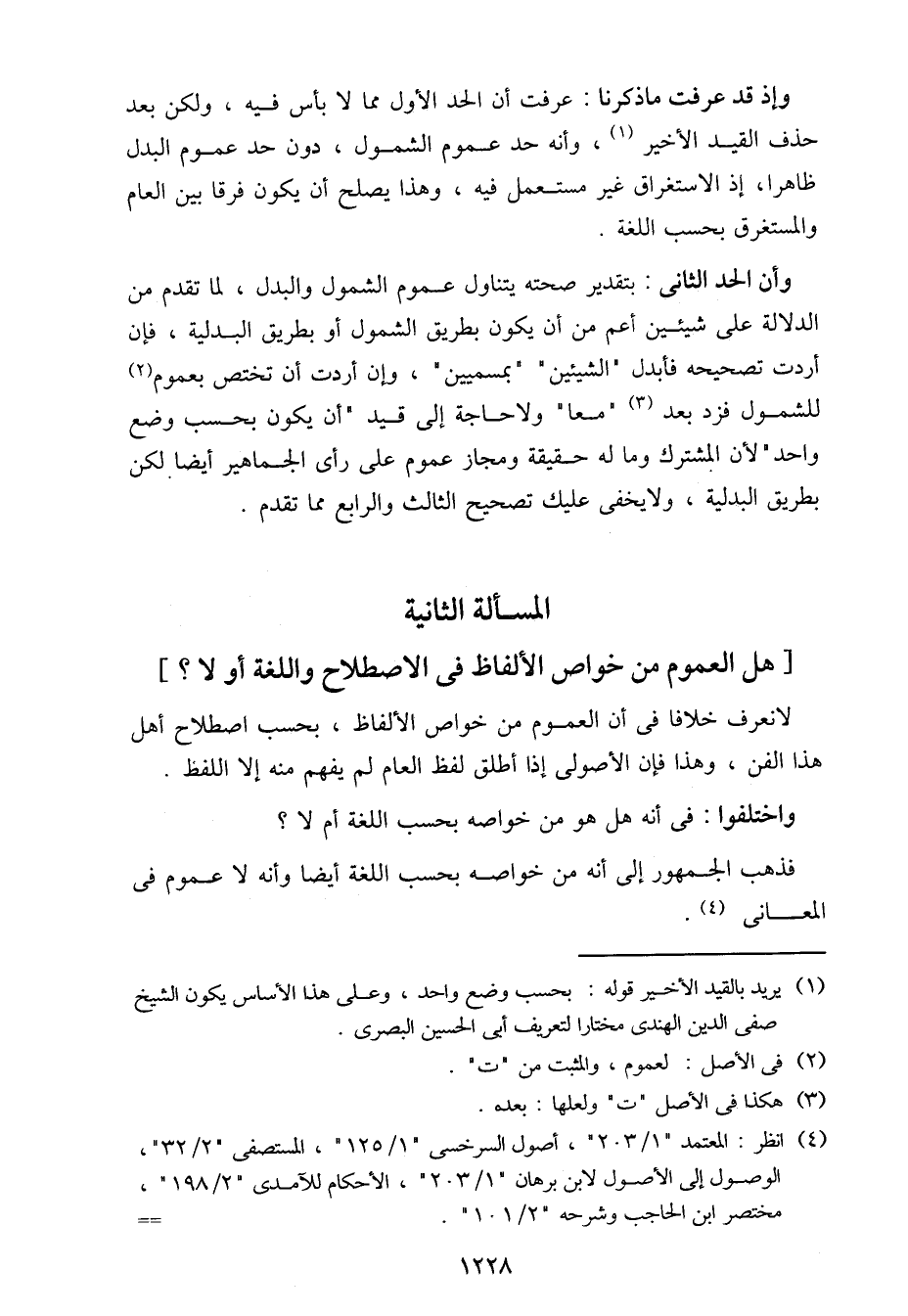 وأن الحد الثاني: بتقدير صحته يتناول عموم الشمول والبدل، لما تقدم من الدلالة على شيئين أعم من أن يكون بطريق الشمول أو بطريق البدلية، فإن أردت تصحيحه فأبدل "الشيئين" "بمسميين"، وإن أردت أن تختص بعموم للشمول فزد بعد "معا" ولا حاجة إلى قيد "أن يكون بحسب وضع واحد" لأن المشترك وما له حقيقة ومجاز عموم على رأي الجماهير أيضا لكن بطريق البدلية، ولا يخفى عليك تصحيح الثالث والرابع مما تقدم.