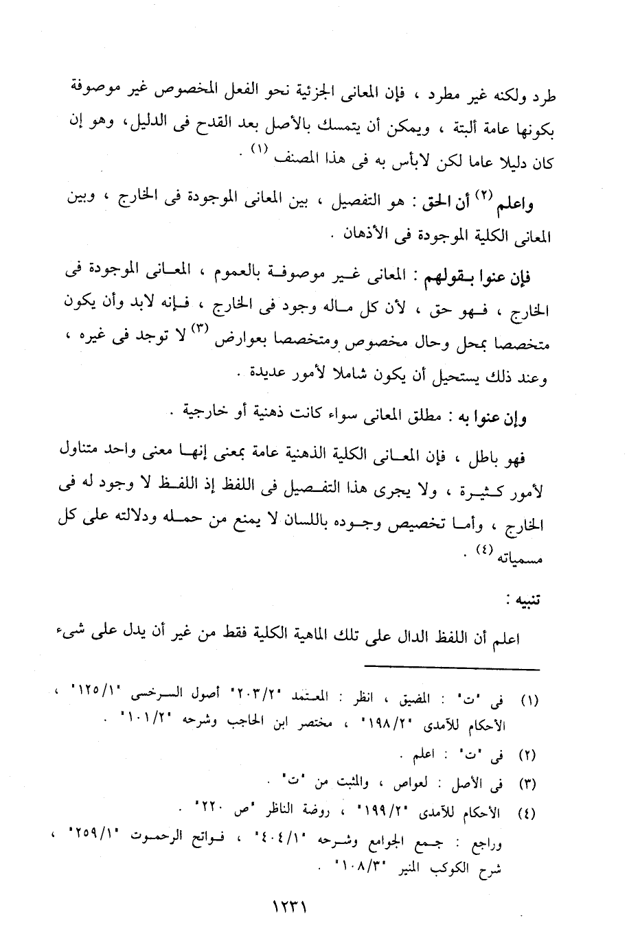 واعلم أن الحق: هو التفصيل، بين المعاني الموجودة في الخارج، وبين المعاني الكلية الموجودة في الأذهان.