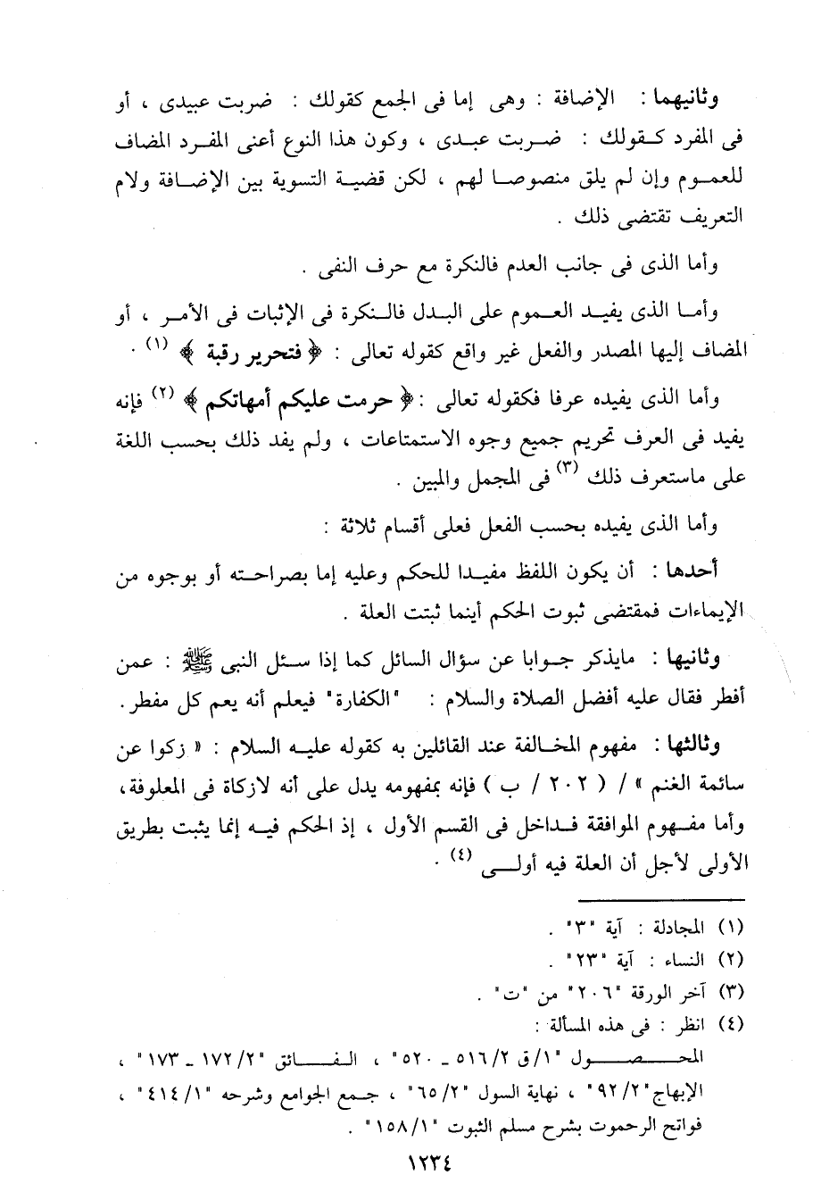 وثانيهما: الإضافة: وهي إما في الجمع كقولك: ضربت عبيدي، أو في المفرد كقولك: ضربت عبدي، وكون هذا النوع أعنى المفرد المضاف للعموم وإن لم يلق منصوصا لهم، لكن قضية التسوية بين الإضافة ولام التعريف تقتضي ذلك.
