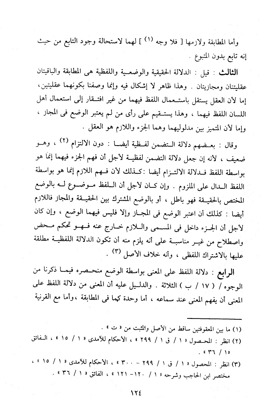 الثالث: قيل: الدلالة الحقيقية والوضعية واللفظية هي المطابقة والباقيتان عقليتان ومجازيتان. وهذا ظاهر لا إشكال فيه وإنما وصفنا بكونهما عقليتين، إما لأن العقل يستقل باستعمال اللفظ فيهما من غير افتقار إلى استعمال أهل اللسان اللفظ فيهما، وهذا يستقيم على رأى من لم يعتبر الوضع في المجاز، وإما لأن المتميز بين مدلوليهما وهما الجزء واللازم هو العقل.