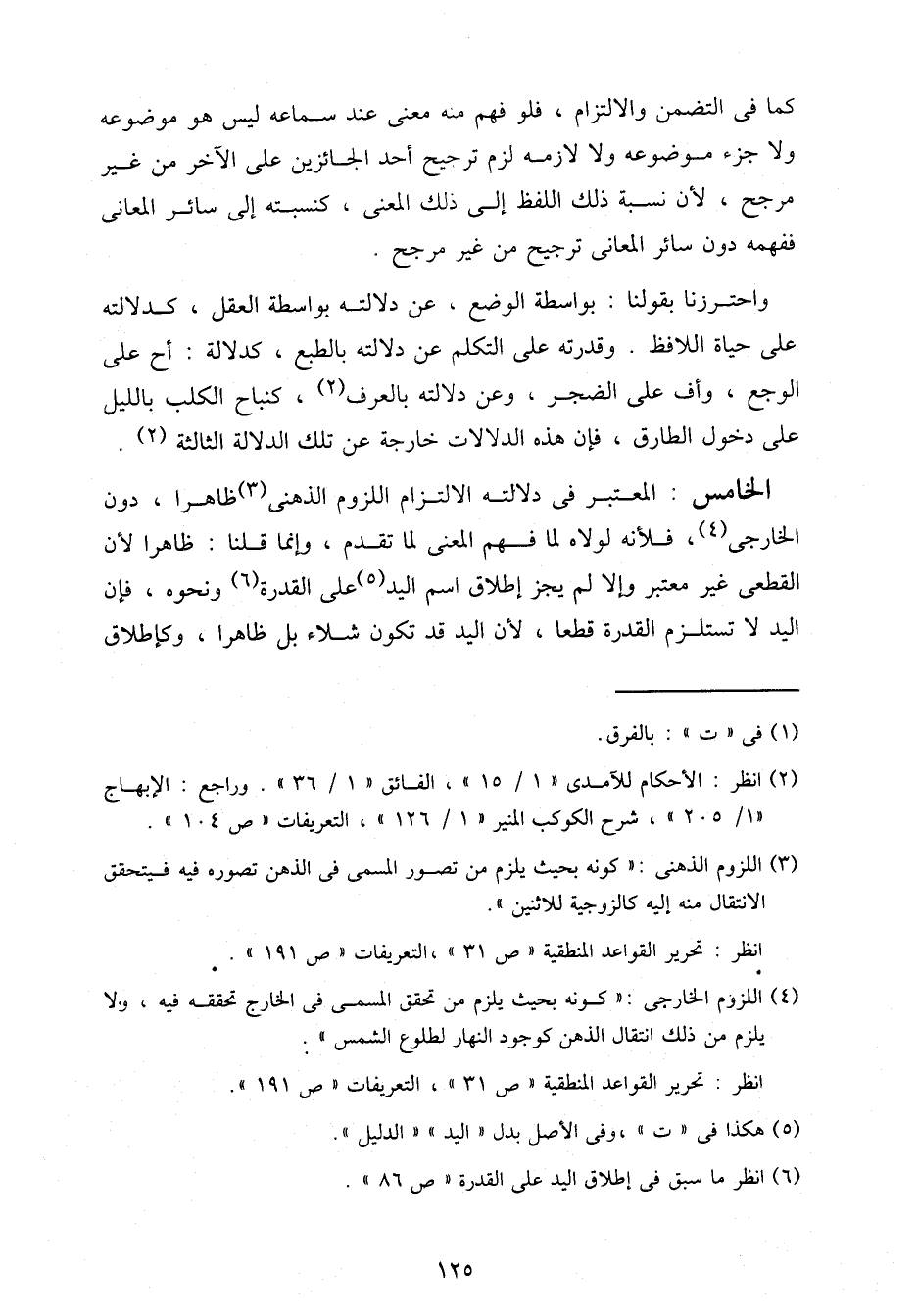 الخامس: المعتبر في دلالته الالتزام اللزوم الذهني ظاهرا، دون الخارجي، فلأنه لولاه لما فهم المعنى لما تقدم، وإنما قلنا: ظاهرا لأن القطعي غير معتبر وإلا لم يجز إطلاق اسم اليد على القدرة ونحوه، فإن اليد لا تستلزم القدرة قطعا، لأن اليد قد تكون شلاء بل ظاهراً، وكإطلاق