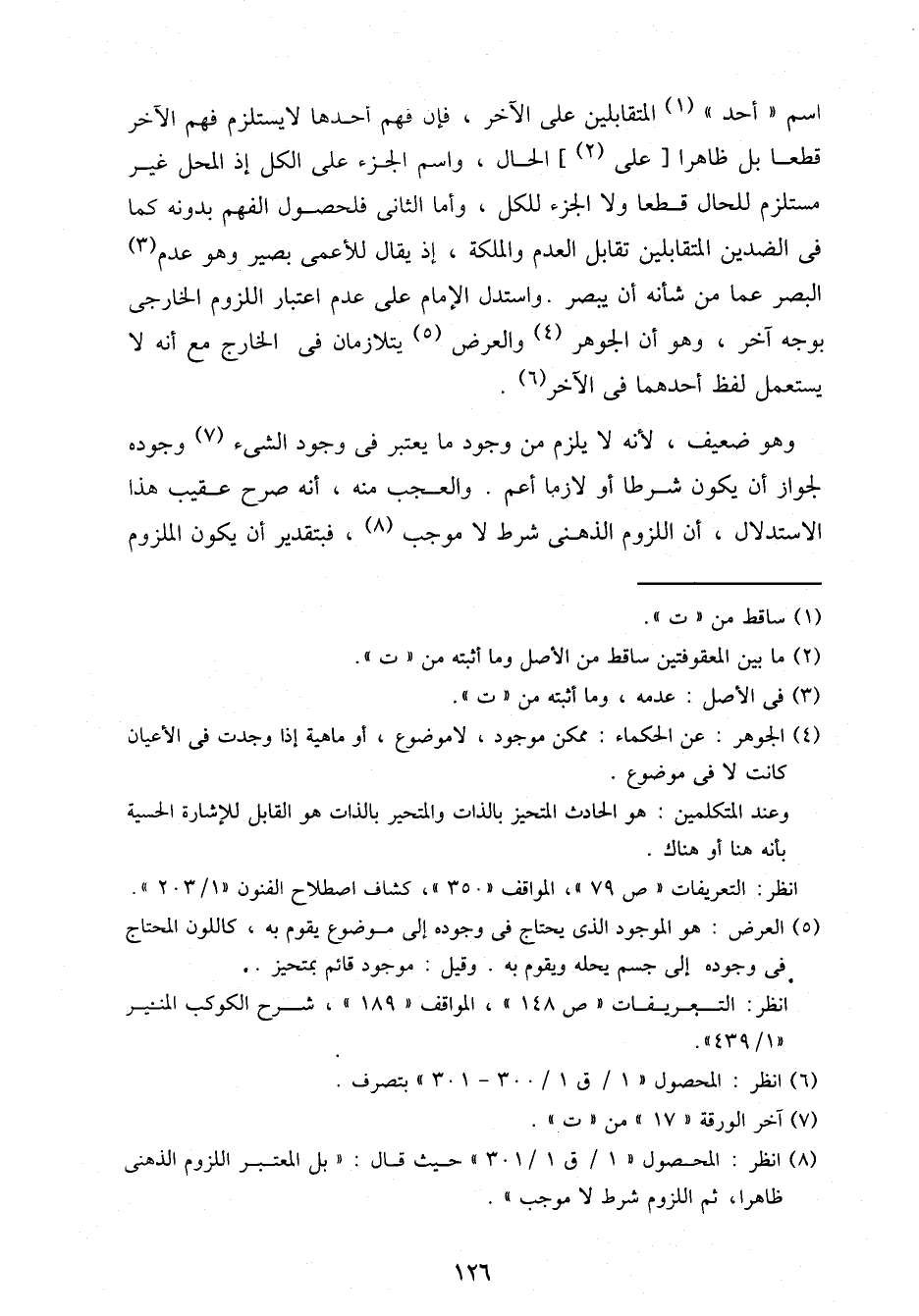 اسم "أحد" المتقابلين على الآخر، فإن فهم أحدهما لا يستلزم فهم الآخر قطعا بل ظاهرا [على] الحال، واسم الجزء على الكل إذ المحل غير مستلزم للحال قطعا ولا الجزء للكل، وأما الثاني فلحصول الفهم بدونه كما في الضدين المتقابلين تقابل العدم والملكة، إذ يقال للأعمى بصير وهو عدم البصر عما من شأنه أن يبصر. واستدل الإمام على عدم اعتبار اللزوم الخارجي بوجه آخر، وهو أن الجوهر والعرض يتلازما في الخارج مع أنه لا يستعمل لفظ أحدهما في الآخر.