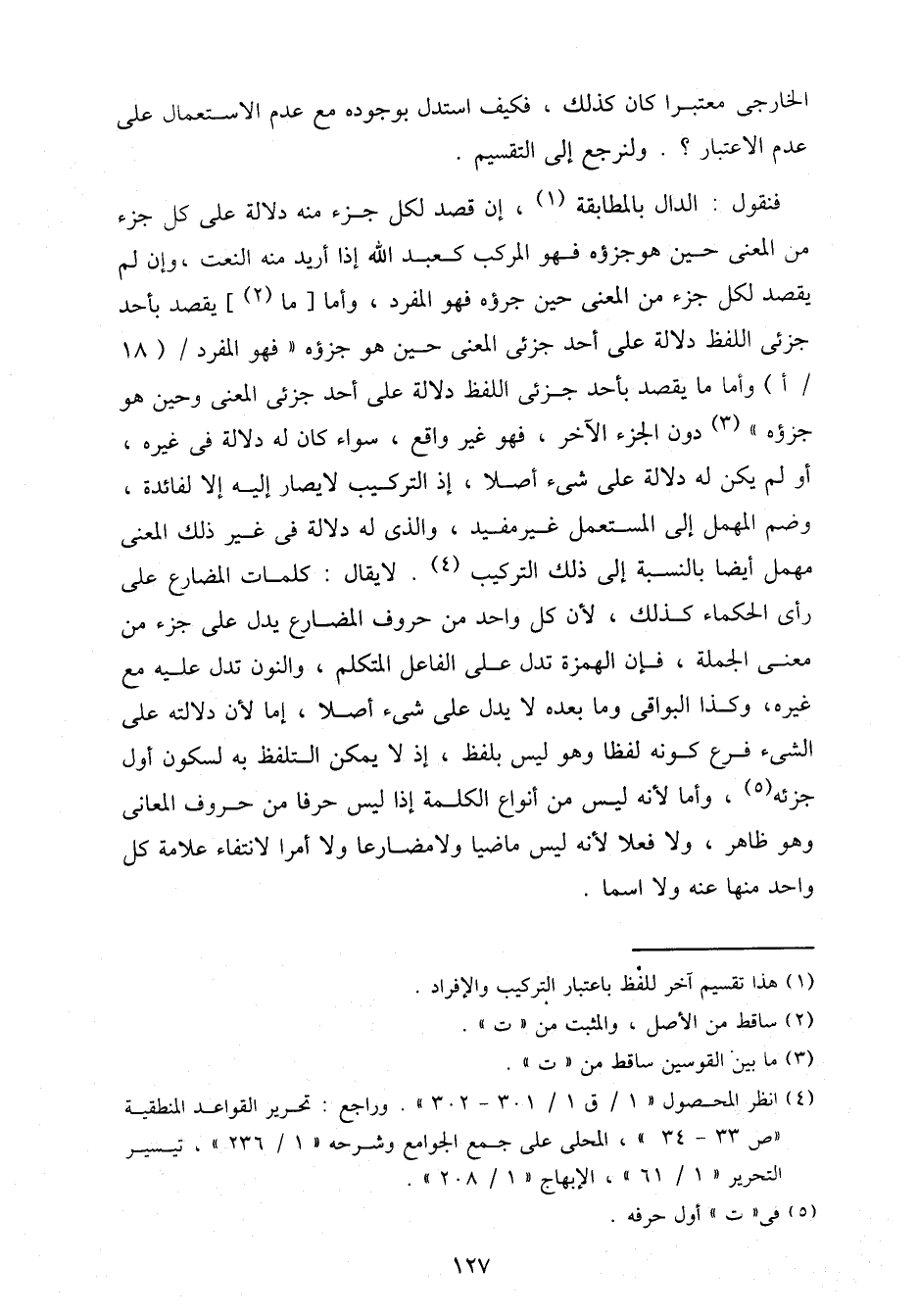 فنقول: الدال بالمطابقة، إن قصد لكل جزء منه دلالة على كل جزء من المعنى حين هو جزؤه فهو المركب كعبد الله إذا أريد منه النعت، وإن لم يقصد لكل جزء من المعنى حين جرؤه فهو المفرد، وأما [ما] يقصد بأحد جزئي اللفظ دلالة على أحد جزئي المعنى حين هو جزؤه "فهو المفرد/ (18/أ) وأما ما يقصد بأحد جزئي اللفظ دلالة على أحد جزئي المعنى وحين هو جزؤه" دون الجزء الآخر، فهو غير واقع، سواء كان له دلالة في غيره، أو لم يكن له دلالة على شيء أصلا، إذ التركيب لا يصار إليه إلا لفائدة، وضم المهمل إلى المستعمل غير مفيد، والذي له دلالة في غير ذلك المعنى مهمل أيضا بالنسبة إلى ذلك التركيب. لا يقال: كلمات المضارع على رأي الحكماء كذلك، لأن كل واحد من حروف المضارع يدل على جزء من معنى الجملة، فإن الهمزة تدل على الفاعل المتكلم، والنون تدل عليه مع غيره، وكذا البواقي وما بعده لا يدل على شيء أصلا، إما لأن دلالته على الشيء فرع كونه لفظا وهو ليس بلفظ، إذ لا يمكن التلفظ به لسكون أول جزئه، وأما لأنه ليس من أنواع الكلمة إذا ليس حرفا من حروف المعاني وهو ظاهر، ولا فعلا لأنه ليس ماضيا ولا مضارعا ولا أمرا لانتفاء علامة كل واحد منها عنه ولا اسما.