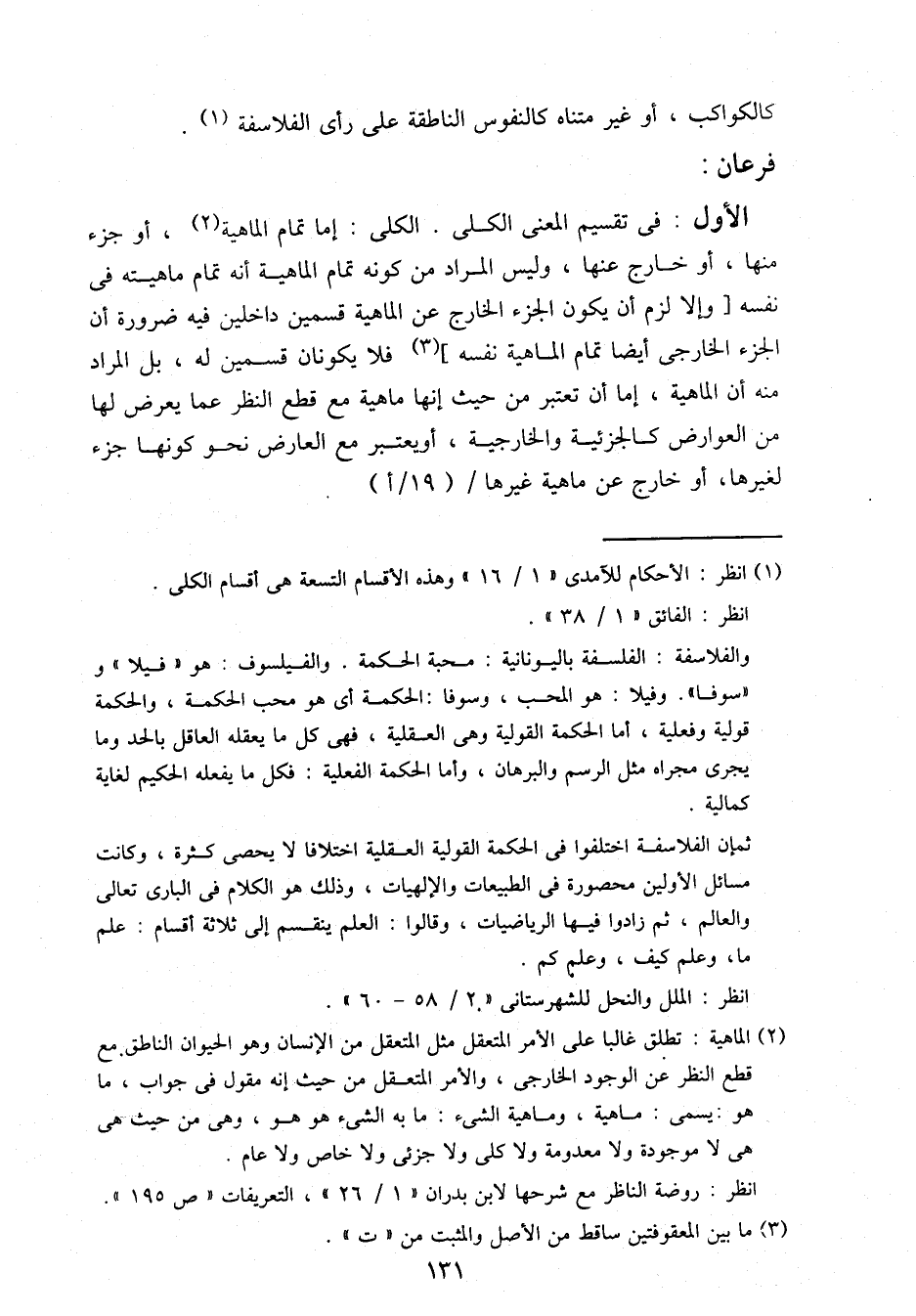 الأول: في تقسيم المعنى الكلي. الكلي: إما تمام الماهية، أو جزء منها، أو خارج عنها، وليس المراد من كونه تمام الماهية أنه تمام ماهيته في نفسه [وإلا لزم أن يكون الجزء الخارج عن الماهية قسمين داخلين فيه ضرورة أن الجزء الخارجي أيضا تمام الماهية نفسه] فلا يكونان قسمين له، بل المراد منه أن الماهية، إما أن تعتبر من حيث إنها ماهية مع قطع النظر عما يعرض لها من العوارض كالجزئية والخارجية، أو يعتبر مع العارض نحو كونها جزء لغيرها، أو خارج عن ماهية غيرها/ (19/أ)