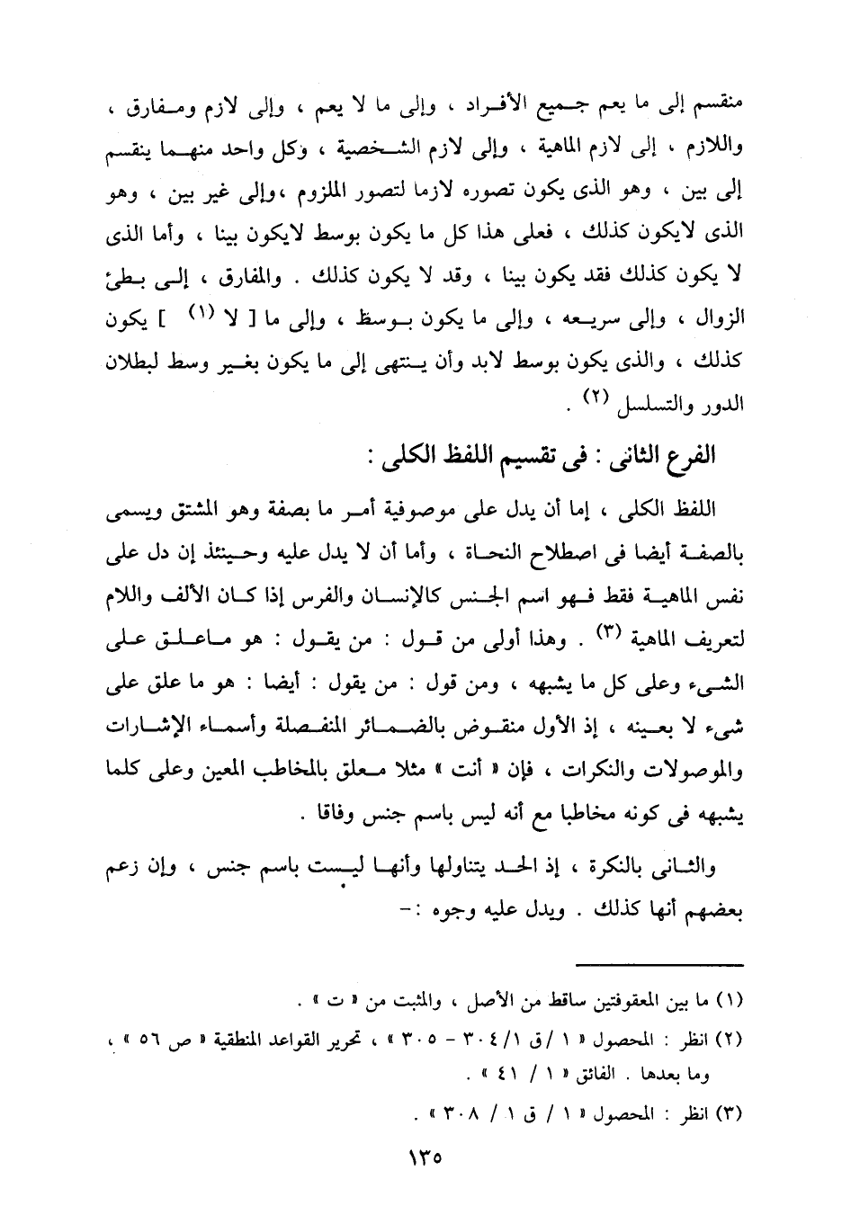 منقسم إلى ما يعم جميع الأفراد، وإلى ما لا يعم، وإلى لازم ومفارق، واللازم، إلى لازم الماهية، وإلى لازم الشخصية، وكل واحد منهما ينقسم إلى بين، وهو الذي يكون تصوره لازما لتصور الملزوم، وإلى غير بين، وهو الذي لا يكون كذلك، فعلى هذا كل ما يكون بوسط لا يكون بينا، وأما الذي لا يكون كذلك فقد يكون بينا، وقد لا يكون كذلك. والمفارق، إلى بطئ الزوال، وإلى سريعه، وإلى ما يكون بوسط، وإلى ما [لا] يكون كذلك، والذي يكون بوسط لابد وأن ينتهي إلى ما يكون بغير وسط لبطلان الدور والتسلسل.